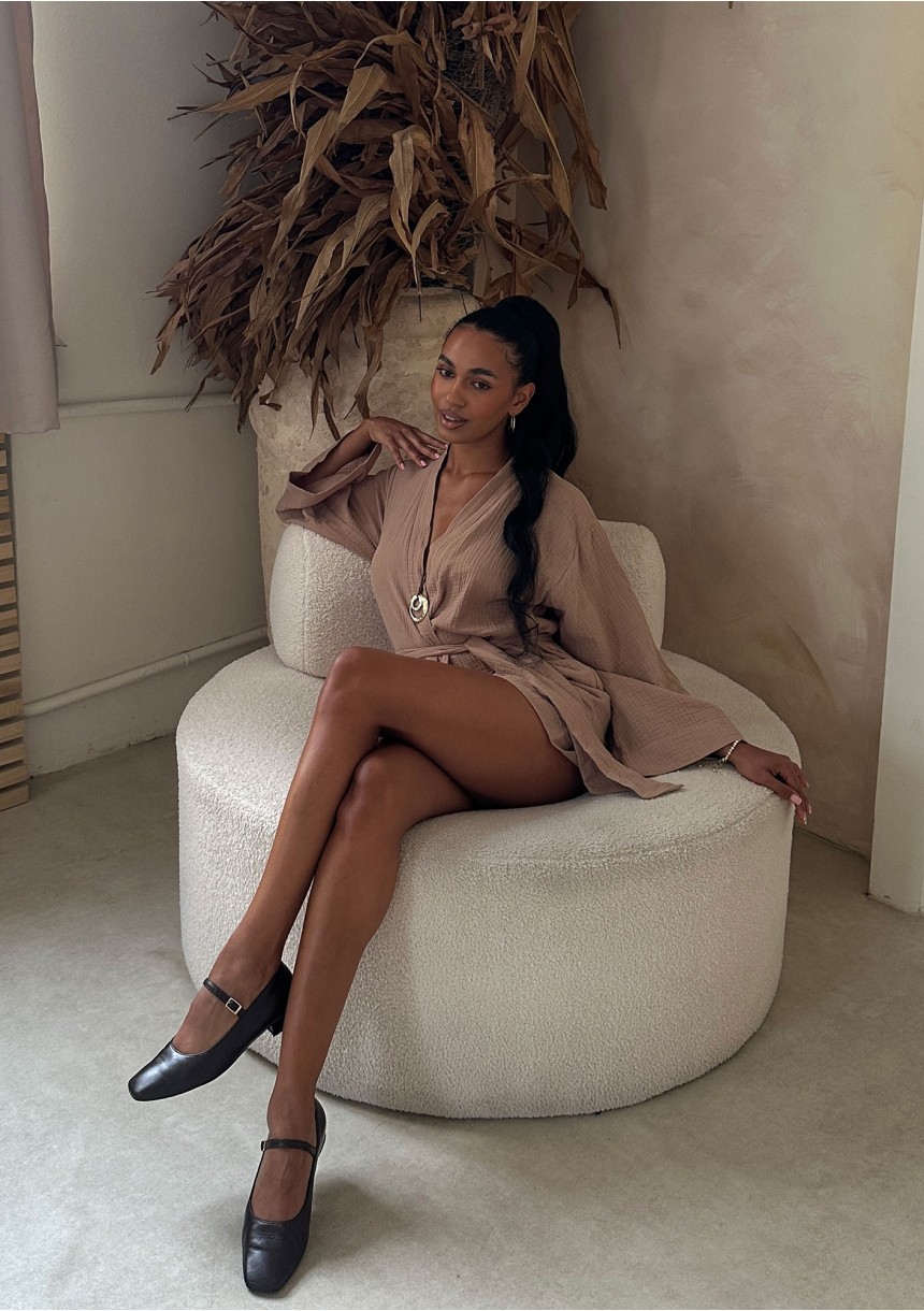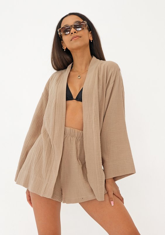 Beżowa narzutka plażowa z wiązaniem zadaje szyku w królującym latem stylu boho. Okrycie jest lekkim, idealnym na upały fasonem, wykonanym z cienkiej tkaniny bawełnianej o fakturze muślinu.