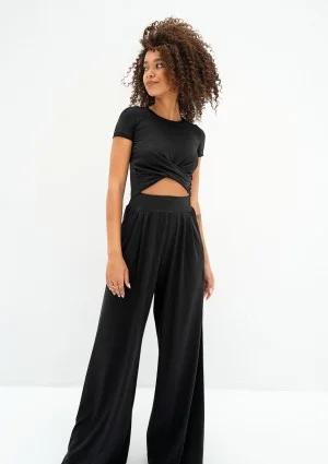 Czarny top damski Nazza stworzyliśmy z tkaniny wiskozowej o delikatnie sprężystej strukturze włókien. Jest przewiewny, wygodny i doskonale układa się na sylwetce. Model stanowi świetny wybór stylizacji na upalne dni. Odsłoni ciało, pięknie eksponując opaloną talię. Modny, krótki krój ze skrzyżowanym materiałem możesz łączyć ze spodniami z wysokim stanem.