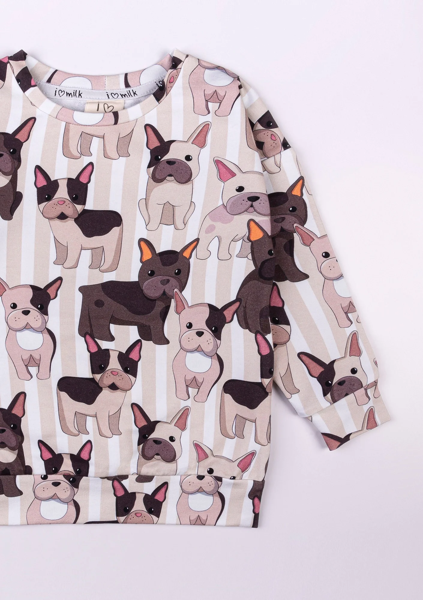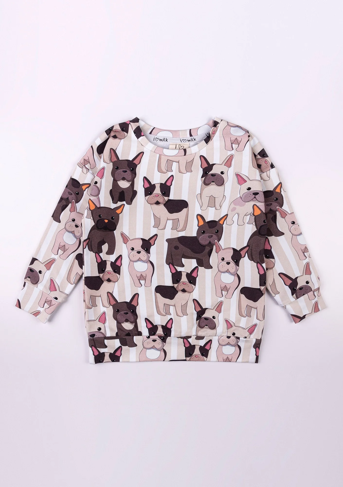 Wygodna bluza dziecięca z modną grafiką to idealny materiał na komfortową i atrakcyjną stylizację. Model ozdobiony uroczymi francuskimi buldogami stanie się ulubionym ubrankiem każdego malucha. Bluza ma uniwersalną kolorystykę, dzięki czemu może trafić zarówno do garderoby chłopca, jak i dziewczynki. Jej atutem jest także klasyczny, swobodny fason ze ściągaczami, gwarantującymi pełen komfort cieplny. Ubranko zakłada się przez głowę przy pomocy zapięcia na dyskretne zatrzaski.