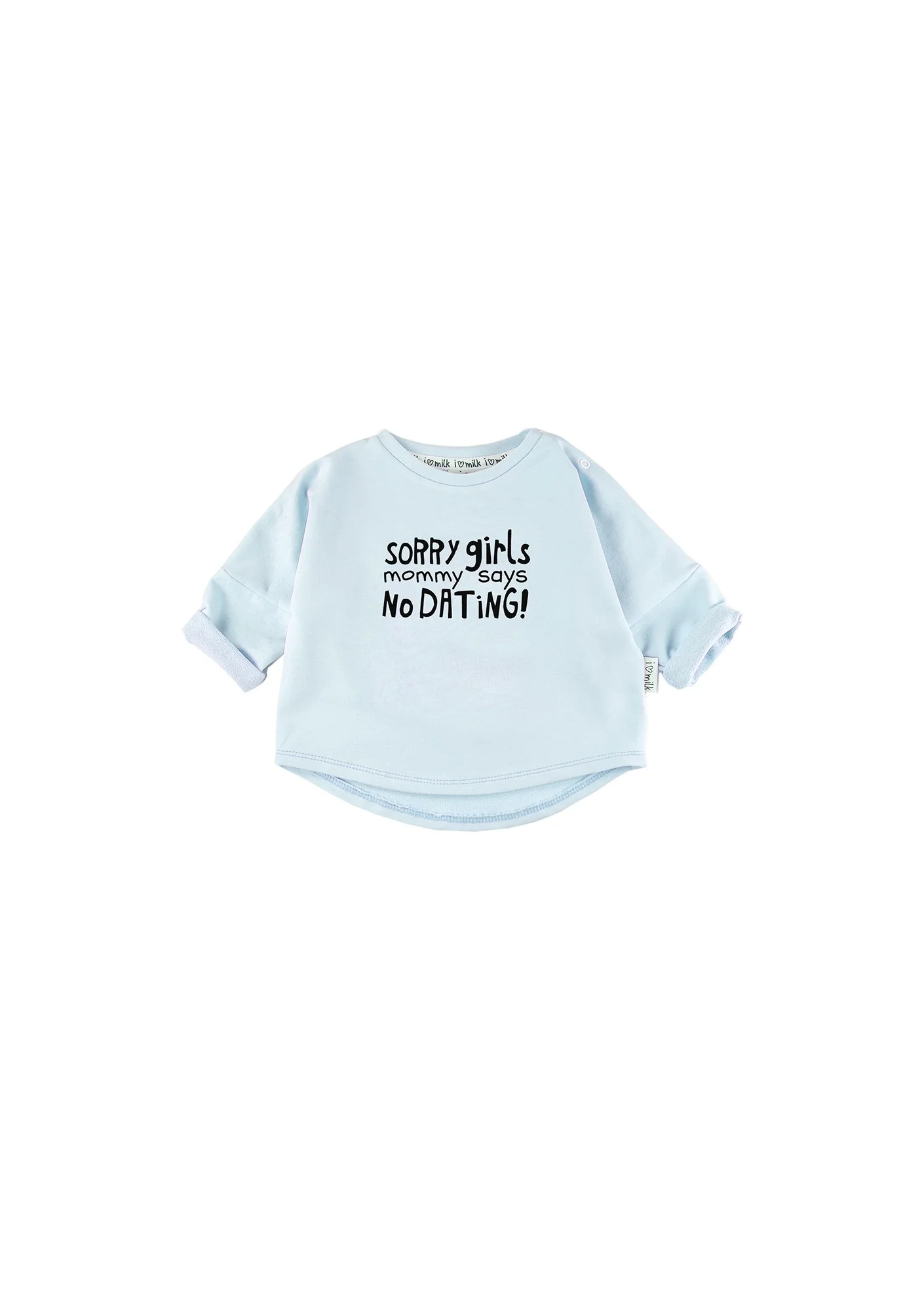 Nadruk "sorry girls, mommy says no dating!" (,,przykro mi dziewczyny, mamusia mówi, że żadnych randek!").
