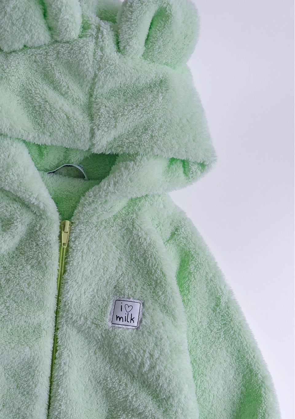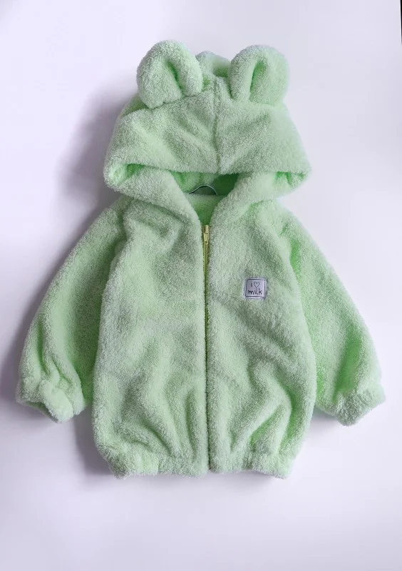 Zielona bluza dziecięca z kapturem przyjemnie otuli ciepłą, futerkową dzianiną. Wygodny i uroczy model na chłodne dni, z kapturem ozdobionym uszami misia.