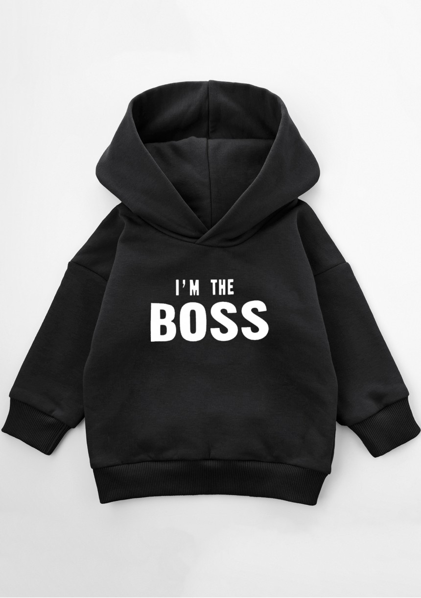Czarna bluza dziecięca z kapturem dla małego szefa lub szefowej. Ubranie z zabawnym napisem zostało starannie wykonane z certyfikowanej dzianiny bawełnianej.
