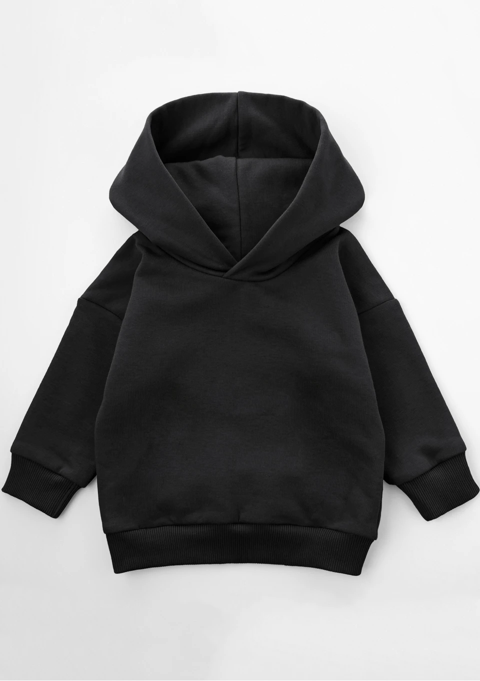 Uniwersalna czarna bluza z kapturem dla dzieci. Model wykonany z miękkiej dzianiny bawełnianej o certyfikowanych włóknach.