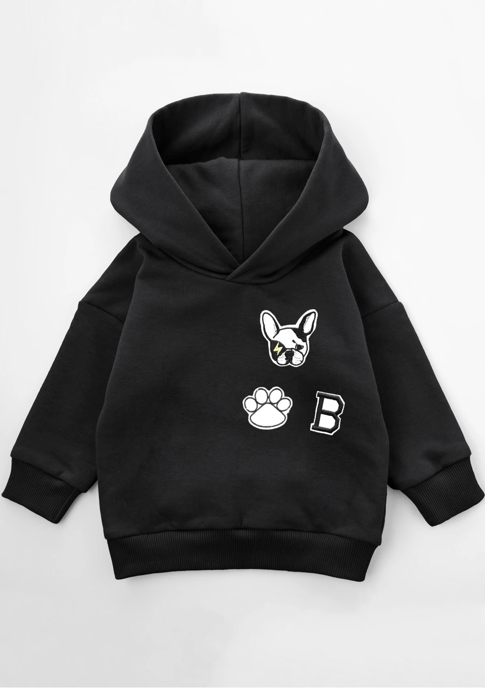 Czarna bluza dziecięca o swobodnym kroju z kapturem i ściągaczami. Model z bawełny, zdobiony naszywkami z motywem buldożka. Idealna na prezent dla małego miłośnika psów.
