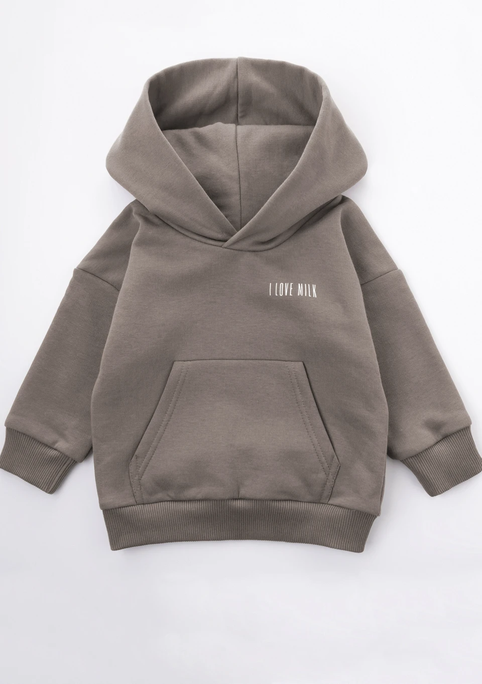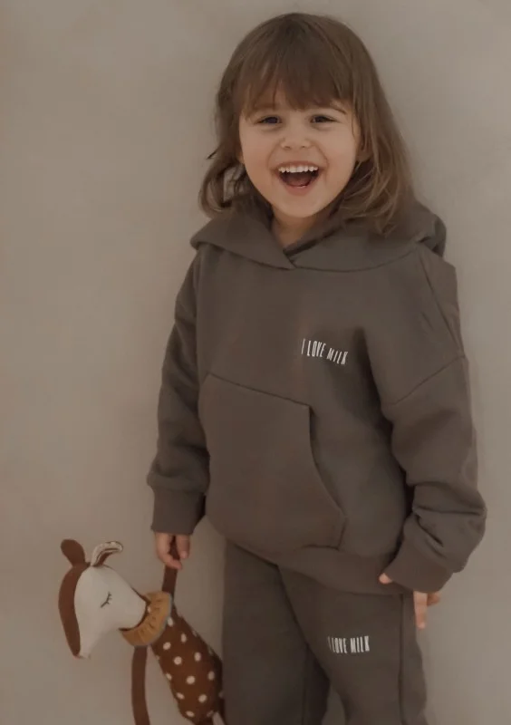 Wygodna kangurka dziecięca z kapturem, uszyta z bawełnianej dzianiny. Ubranko ma ładny, bardzo elegancki i uniwersalny odcień taupe.