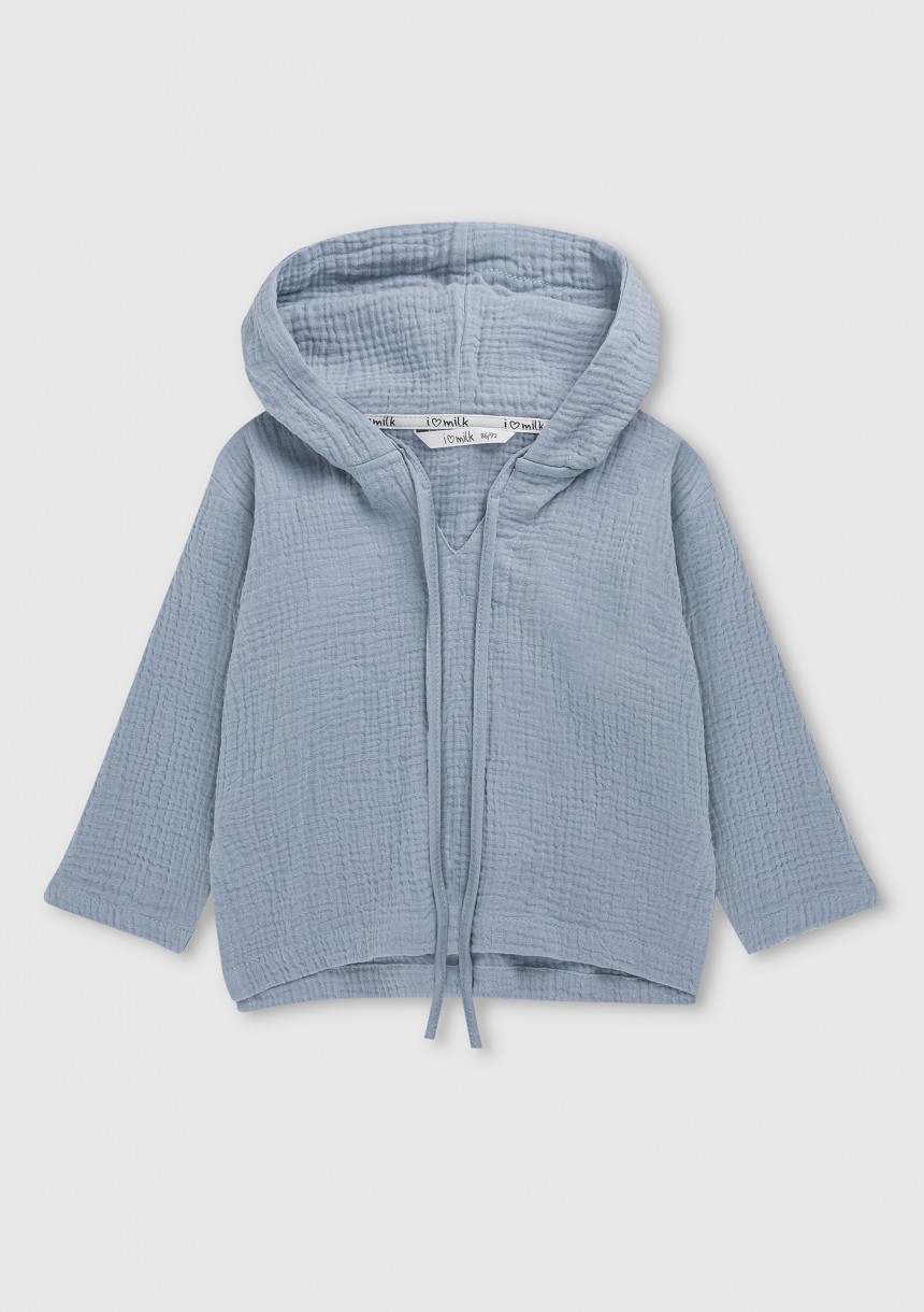 Błękitna bluza z kapturem dla dzieci uszyta z lekkiego muślinu. Ubranko niezastąpione podczas wakacji i zabawy na dworze.