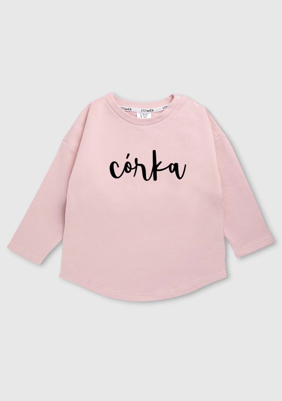 Pudroworóżowa bluza dla dziewczynki z certyfikowanej dzianiny. Ubranko z zatrzaskami na ramieniu i starannie wykonanym napisem.