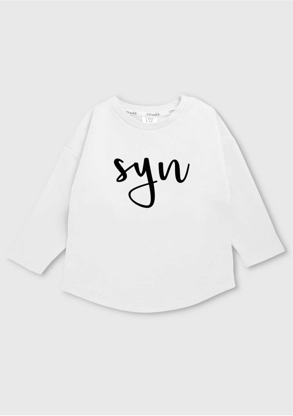 Biała bluza bawełniana dla chłopca ze starannie wykonanym napisem ,,syn". Uniwersalny fason przyda się przy najzwyklejszych okazjach.