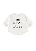 Bluza dziecięca, odpowiednia zarówno dla chłopca jak i dla dziewczynki z wymownym napisem w kolorze czarnym "The real Boss" ("Prawdziwy szef") idealna dla dzieci mających kontrolę nad zapatrzonymi w nie rodzicami z poczuciem humoru. Dostępna w klasycznej bieli. Podwinięte rękawy oraz zastosowanie wysokiej jakości bawełny (95%) z domieszką elastanu (zapobiegającemu gnieceniu się materiału) sprawią, że Twojemu dziecku będzie w niej komfortowo, niezależnie od tego co aktualnie zarządzi. Ten luźnej, funkcjonalnej bluzie żadne harce nie będą straszne - zniesie je dzielnie, nie tracąc fasonu.
