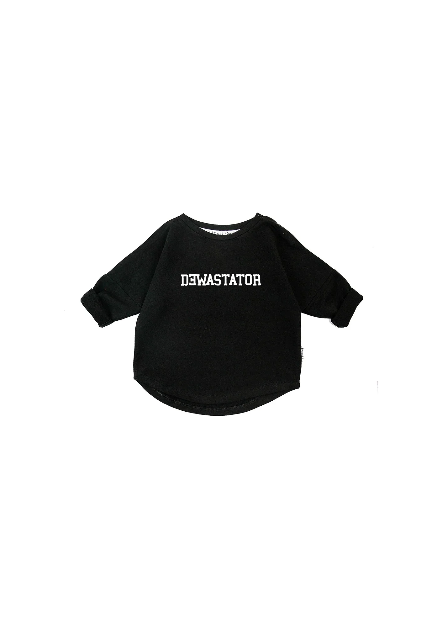 Czarna bluza dla dziecka z białym napisem "Dewastator" sprawi, że Twoje dziecko będzie nie tylko wyglądać modnie, ale też czuć się dobrze. Przeznaczona zarówno dla chłopca, jak i dla dziewczynki. Wygodna za sprawą kroju oversize, umożliwi Twojemu dziecku nieograniczoną zabawę - może w niej skakać, biegać, podnosić wysoko ręce, a nawet ćwiczyć - jednym słowem może robić wszystko, na co najdzie je ochota (a biorąc pod uwagę napis, lepiej minimalizować ryzyko pojawienia się nadprogramowych szkód). Napy na ramionach sprawią, że zakładanie i ściąganie jej stanie się znacznie prostsze dla wszystkich małych chłopców i dziewczynek.