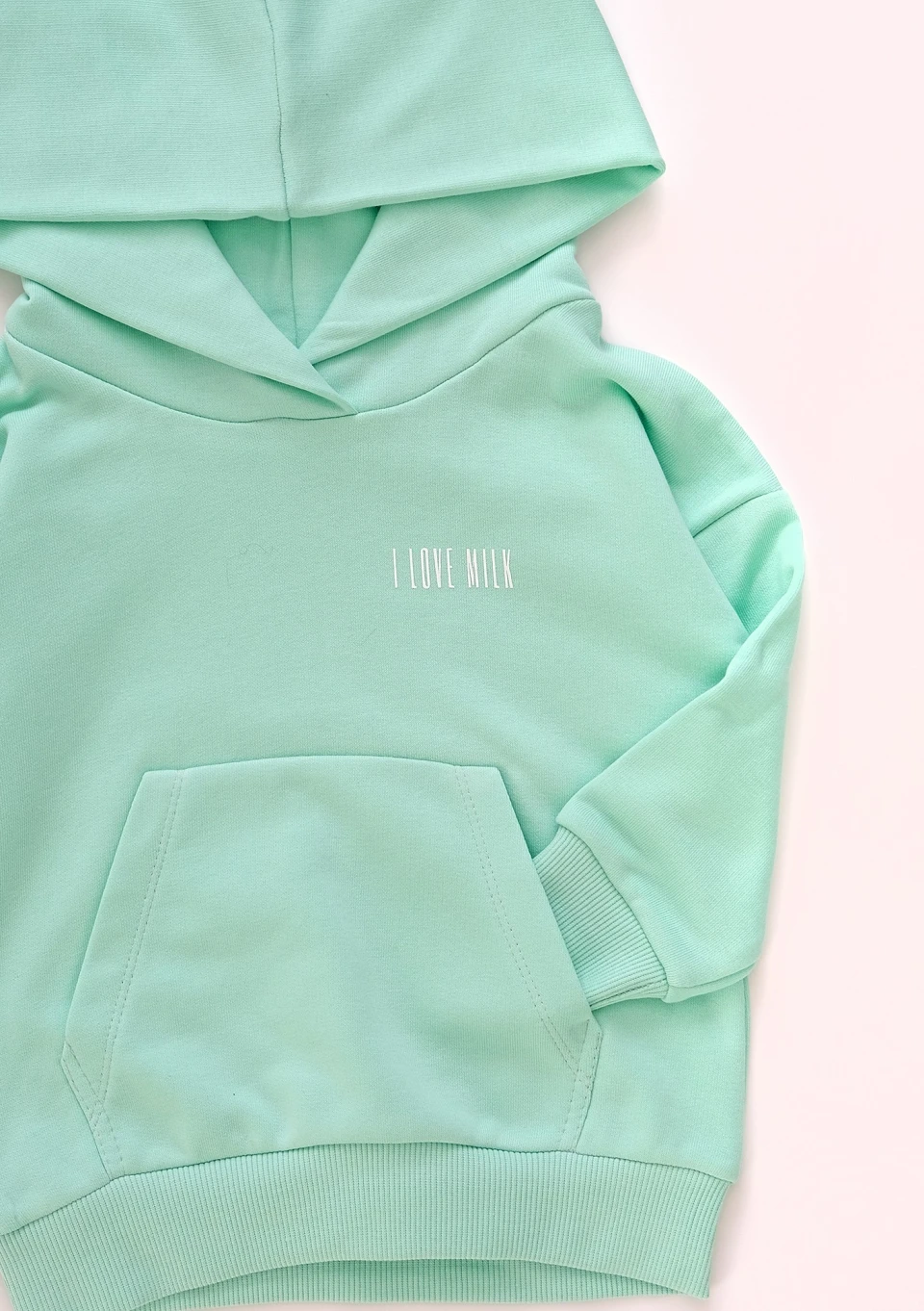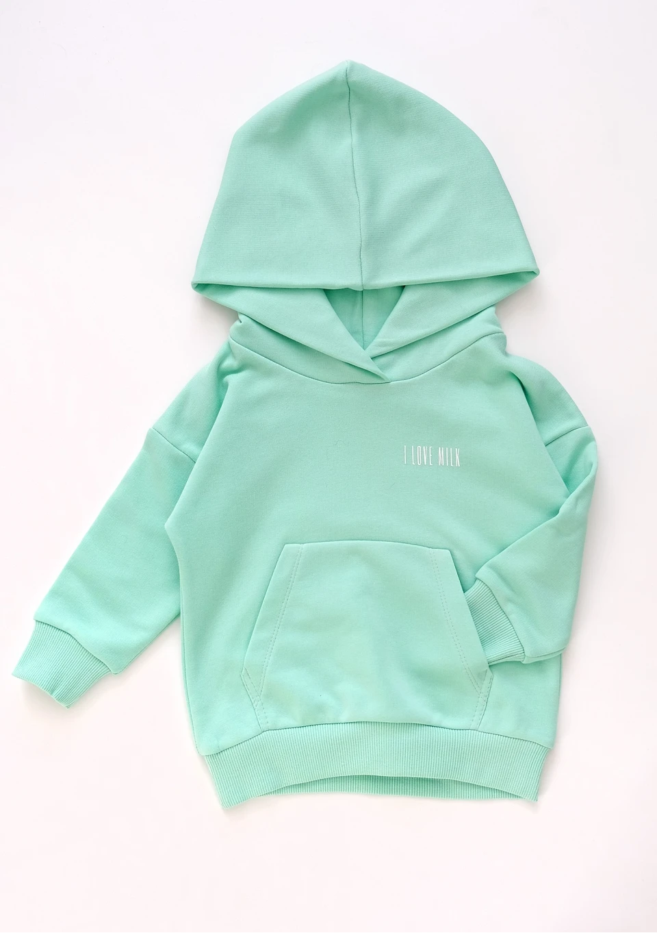 Miętowa bluza kangurka z kapturem dla dzieci wykonana z miękkiej dzianiny z pętelkowym spodem. Będzie idealnym uzupełnieniem wiosenno - letniej szafy malucha.