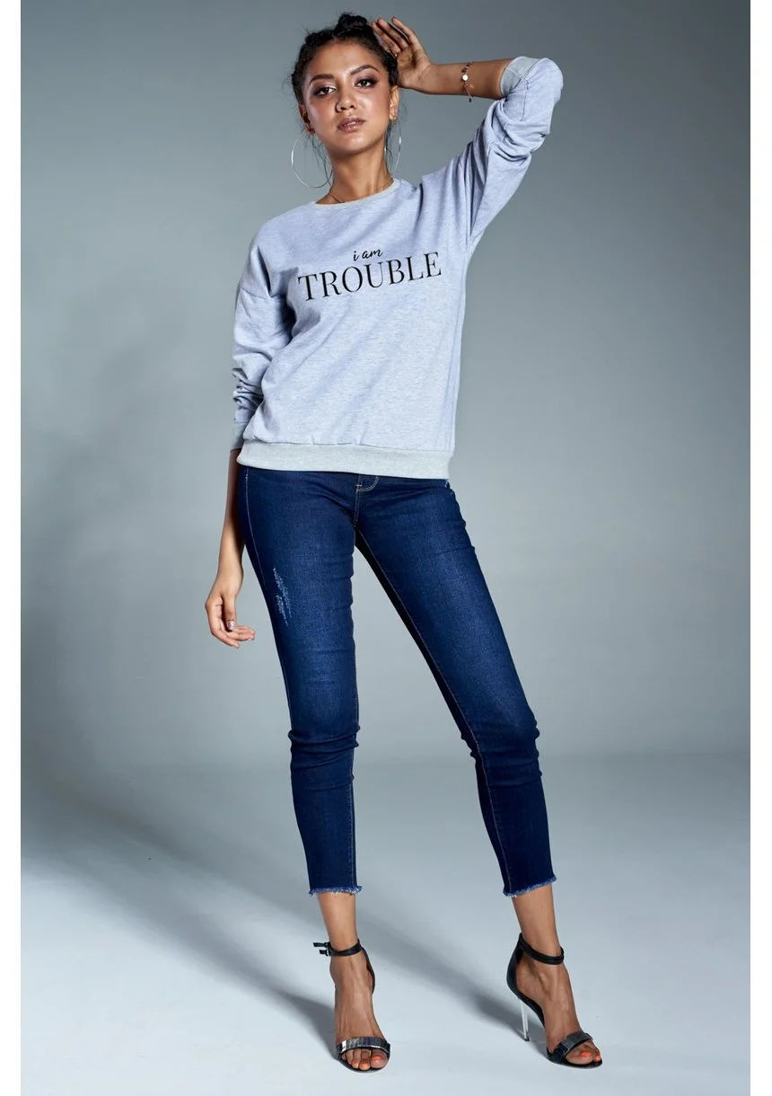 Stylowe szarości i modny nadruk to połączenie, dzięki któremu uszyta w Polsce bluza Mosquito zachwyca miłośniczki sportowego, swobodnego stylu. Lekka i ciepła bluza sprawdza się o każdej porze roku, dlatego jest znakomitym elementem codziennej garderoby. Swobodny krój i praktyczna ściągacze na mankietach oraz biodrach sprawiają, że ubranie zapewnia możliwość wykonywania dowolnych ruchów i daje poczucie wyjątkowego komfortu. Dodatkowo ściągacze sprawiają, że bluza damska świetnie układa się na sylwetce bez względu na rozmiar, podkreślając jej atuty. Bluza Mosquito jest w całości uszyta z materiałów wysokiej jakości. Naturalne włókna bawełniane zapewniają ciepło zimą i dają komfort w czasie letnich spacerów, przepuszczając powietrze i miękko otulając skórę. Z pewnością będziesz w pełni zadowolona z modnej i stylowej bluzy, którą łatwo skomponujesz z wieloma różnymi stylizacjami. Możesz nosić ją wraz z jeansami, jegginsami, szortami, a nawet spódnicami uszytymi z dresówki. Dzięki temu każdego dnia stworzysz inną sportową lub casualową stylizację, którą zaskoczysz wszystkich dookoła. Na uwagę zasługuje nadruk Im Trouble, podkreślający nowoczesny styl odzieży i dodający charakteru codziennym outfitom.