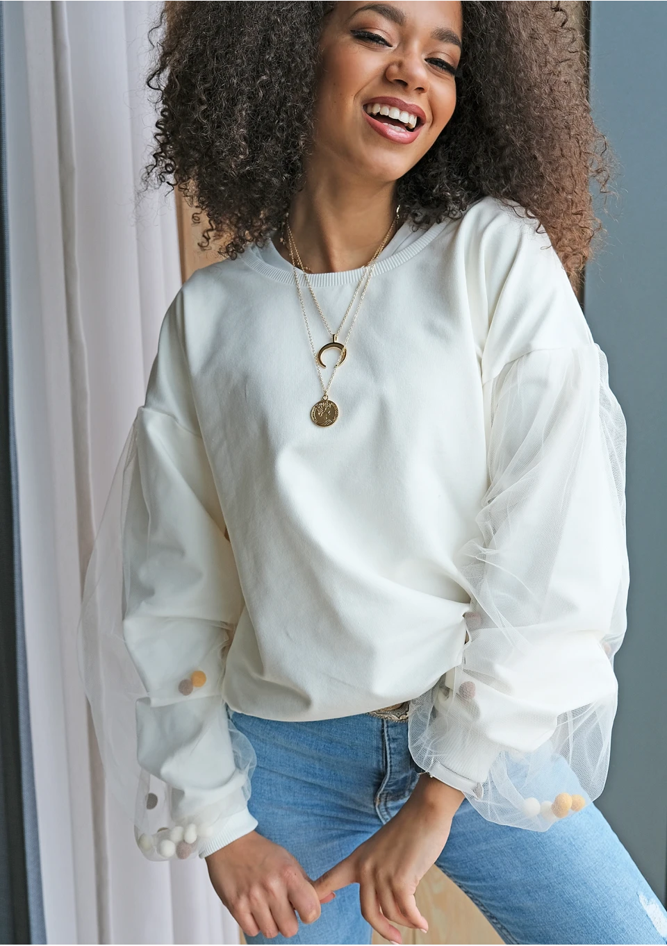 Urocza bluza z pomponami w tiulowym naszyciu rękawów. Model dla mamy, wykonany z elastycznej dzianiny bawełnianej w kremowym odcieniu bieli.