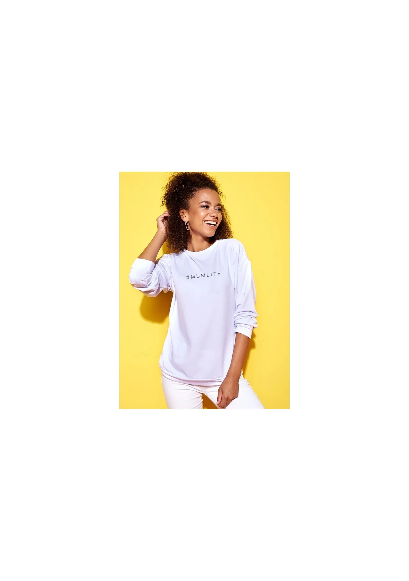 Wygodna bluza „#MUMLIFE” szyta jest z myślą o aktywnych mamach. Jej luźne, podwijane rękawy, a także nieopinający sylwetki krój pozwalają na zachowanie pełnej swobody ruchów. Biała bluza damska bez kaptura dla mamy może być noszona nie tylko podczas opieki nad maluchem w domu, lecz także na wspólnych spacerach. Jej modny krój i ciepły materiał sprawdzą się zwłaszcza wiosną i jesienią. Bluzę polecamy zestawiać z ubrankiem dla dziecka o tym samym motywie.