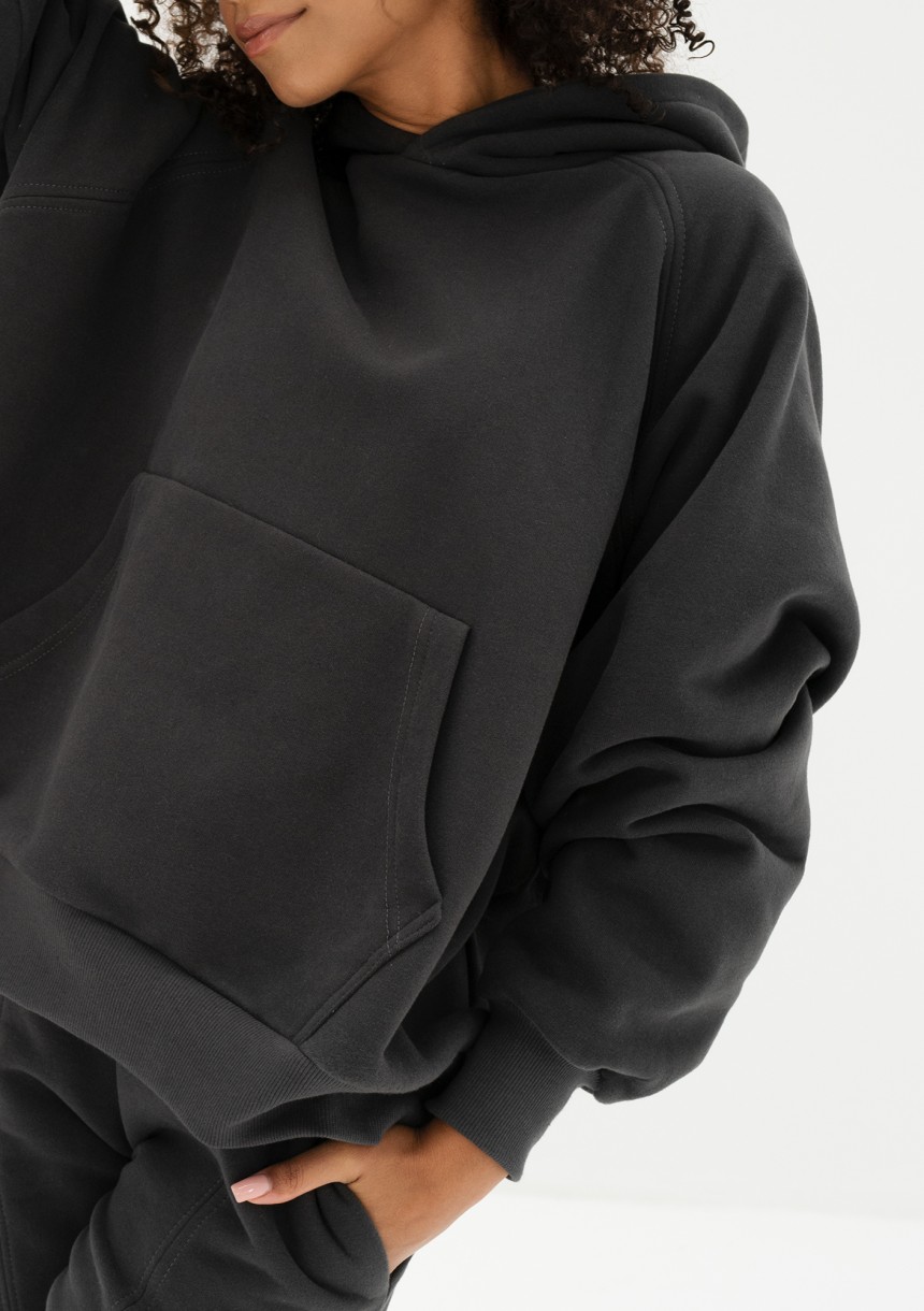 Grafitowa bluza damska oversize, zdobiona haftowanym logiem na kapturze. Uszyta z miękkiej dzianiny z meszkiem po wewnętrznej stronie.