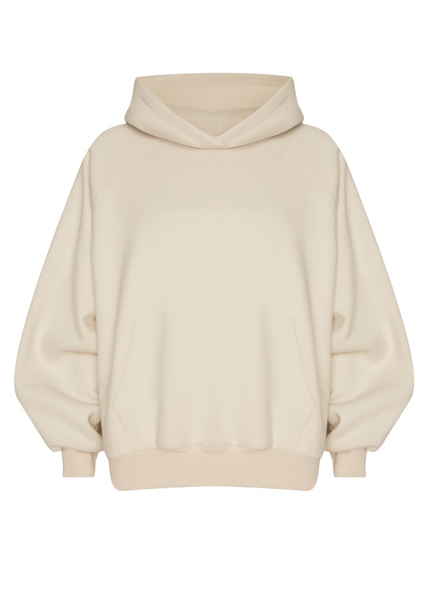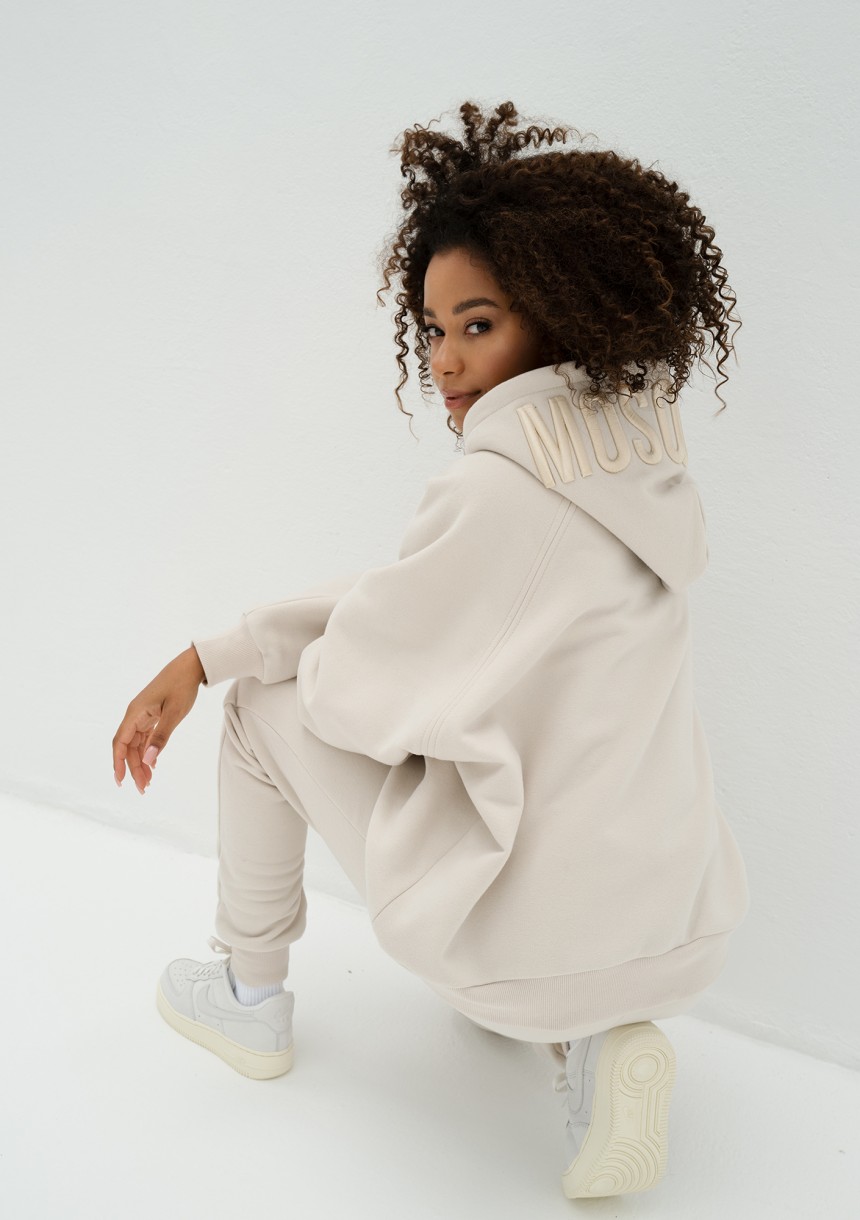 Wygodna bluza damska o bardzo luźnym kroju oversize z kapturem, na którym widnieje duże, naszywane logo marki Mosquito. Przepiękny model o efektownym designie należy do kategorii premium. Materiał dresowy, z którego powstała ta kangurka, posiada przyjemną w dotyku fakturę. Od spodu jest wysłana miękkim meszkiem. Bluza damska w kolorze kokosowej bieli świetnie połączy się z dedykowanymi spodniami, które znajdziesz w naszej kolekcji.
