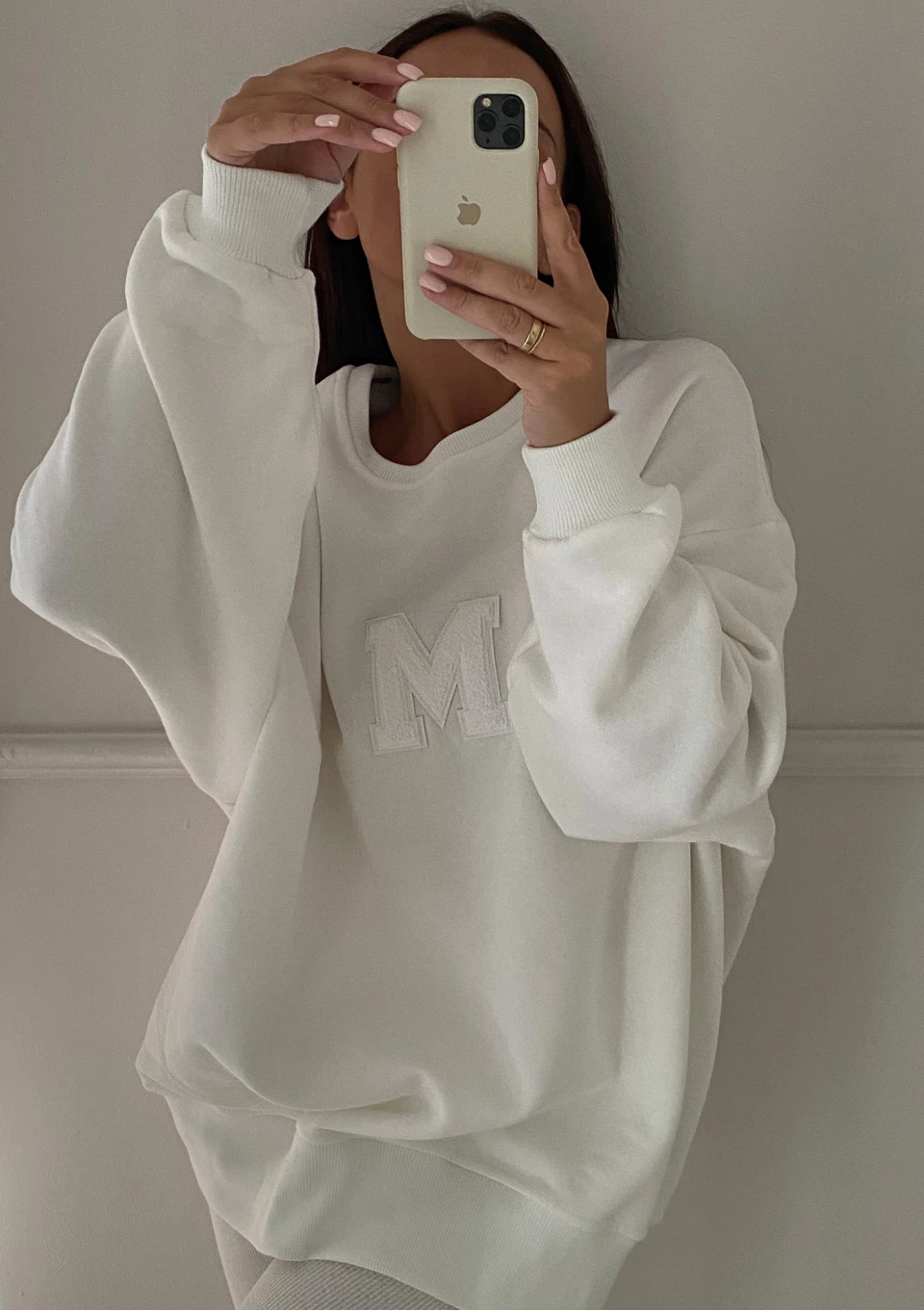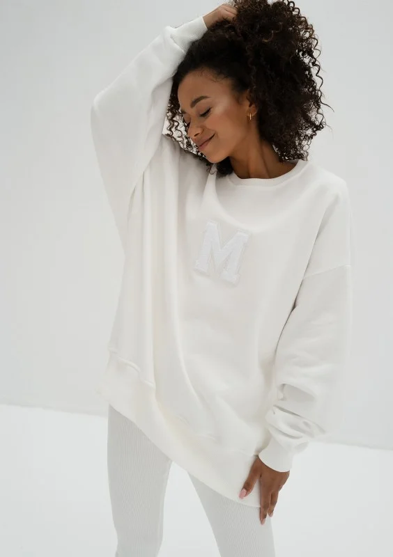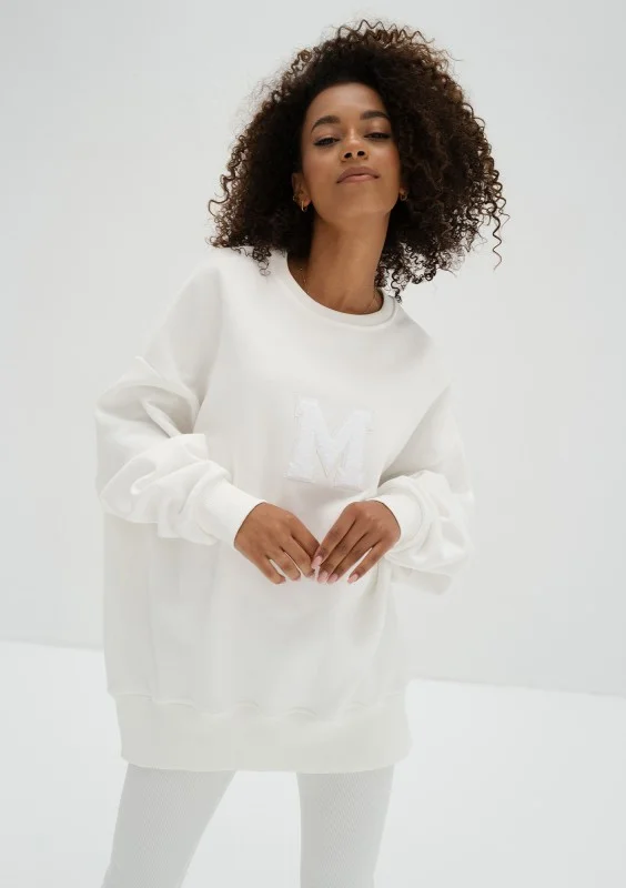 Modna bluza damska oversize z miękkiej i przyjemnie puszystej od spodu dzianiny dresowej. Model ze stylową naszywką "M".