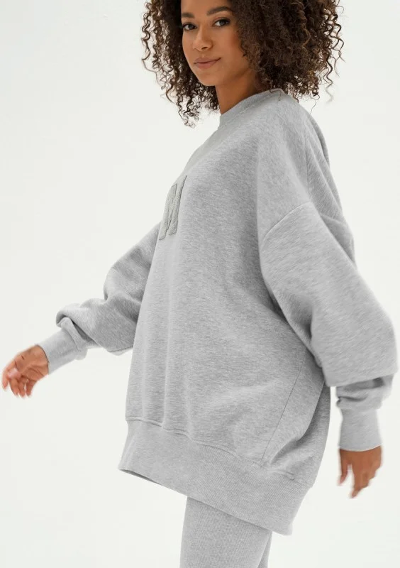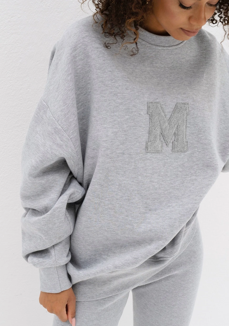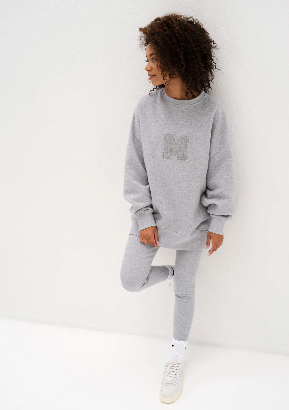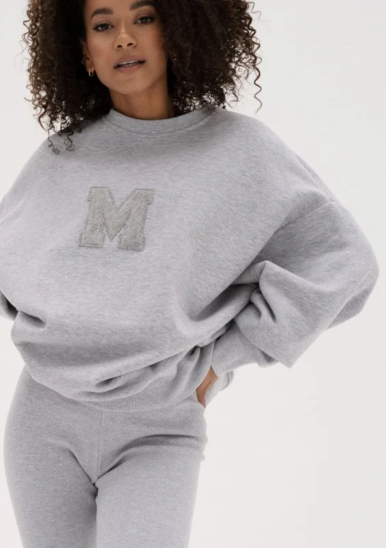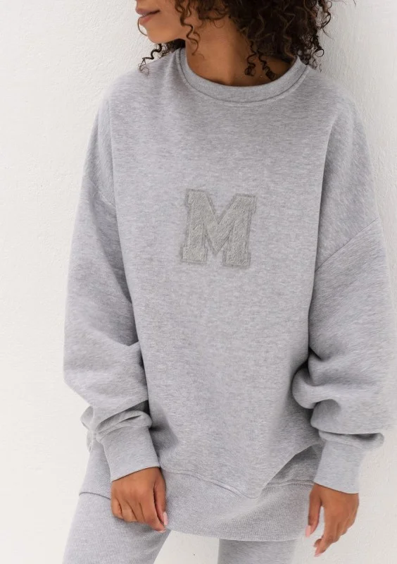 Szara bluza damska oversize z miękkiej i przyjemnie puszystej od spodu dzianiny dresowej. Model ze stylową naszywką "M".