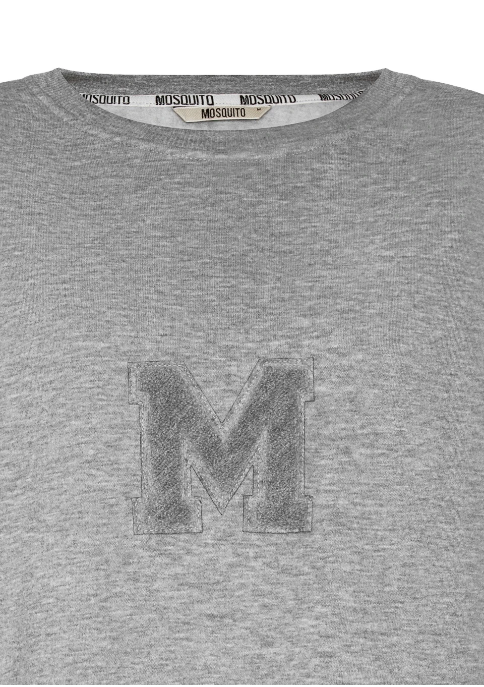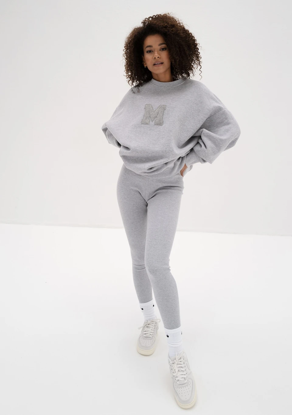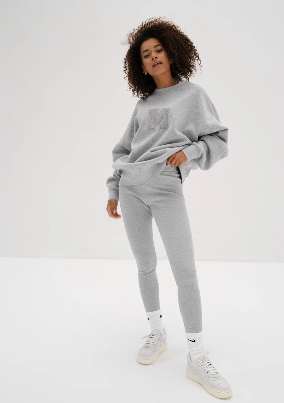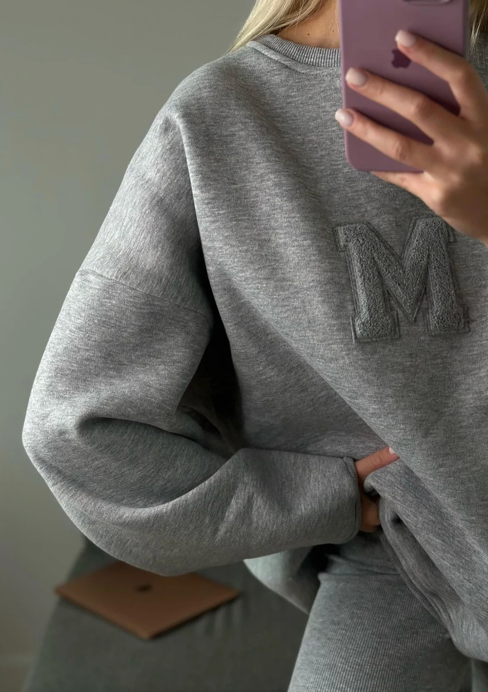 Szara bluza damska oversize z miękkiej i przyjemnie puszystej od spodu dzianiny dresowej. Model ze stylową naszywką "M".
