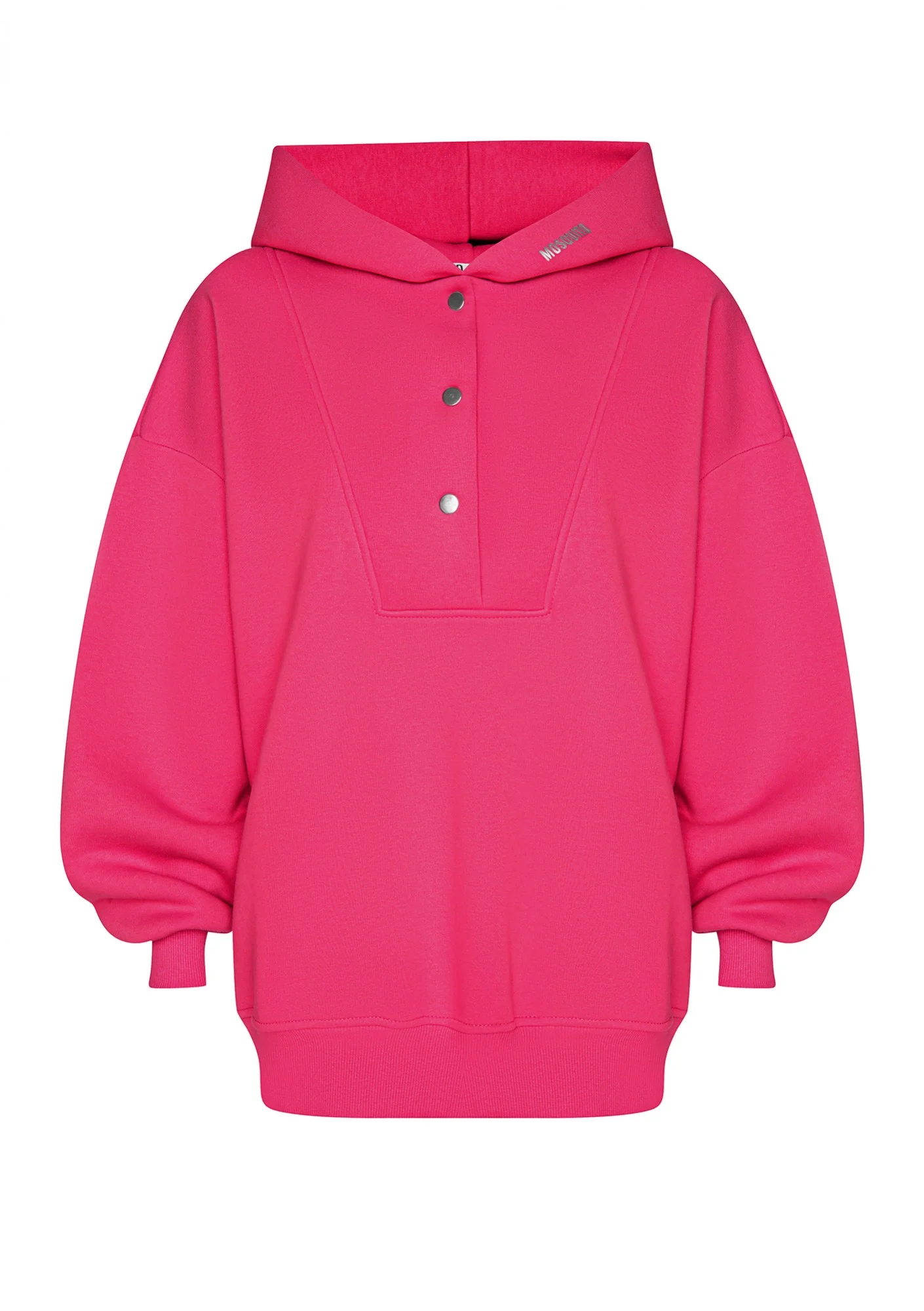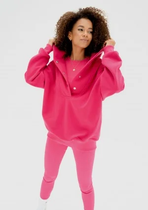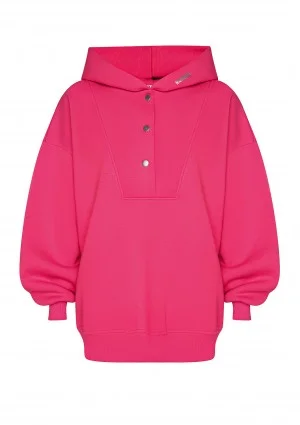 Wyjątkowa, przyjemnie wygodna i ciepła bluza damska dresowa z zapinanym na zatrzaski dekoltem i kapturem. Model w intensywnym różu, który doda Ci energii i mocno zwróci uwagę otoczenia. Kobiecy, zmysłowy odcień zdobi również legginsy i dopasowany top, z którymi prezentowana bluza stworzy wygodny i stylowy comfy look.