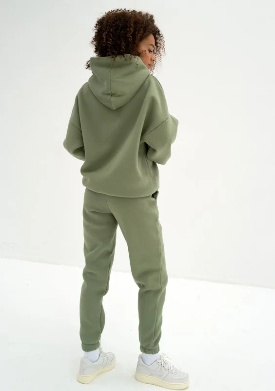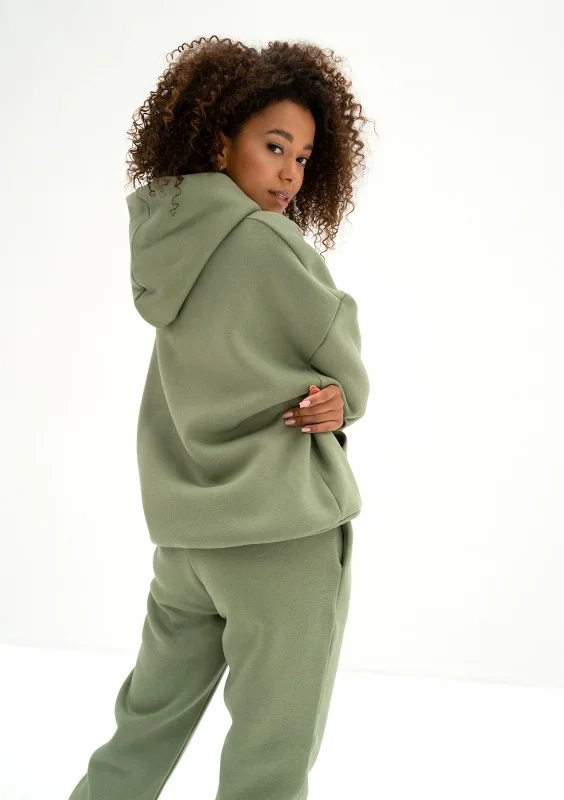 Oliwkowa bluza damska z kapturem o modnym kroju oversize. Model z miękkiej dzianiny bawełnianej z przyjemnym meszkiem od spodu.