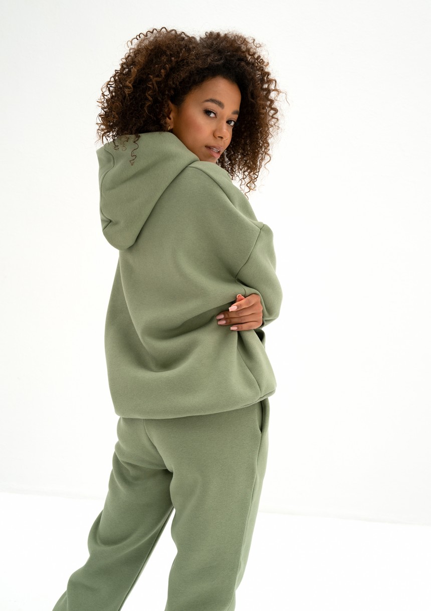 Oliwkowa bluza damska z kapturem o modnym kroju oversize. Model z miękkiej dzianiny bawełnianej z przyjemnym meszkiem od spodu.