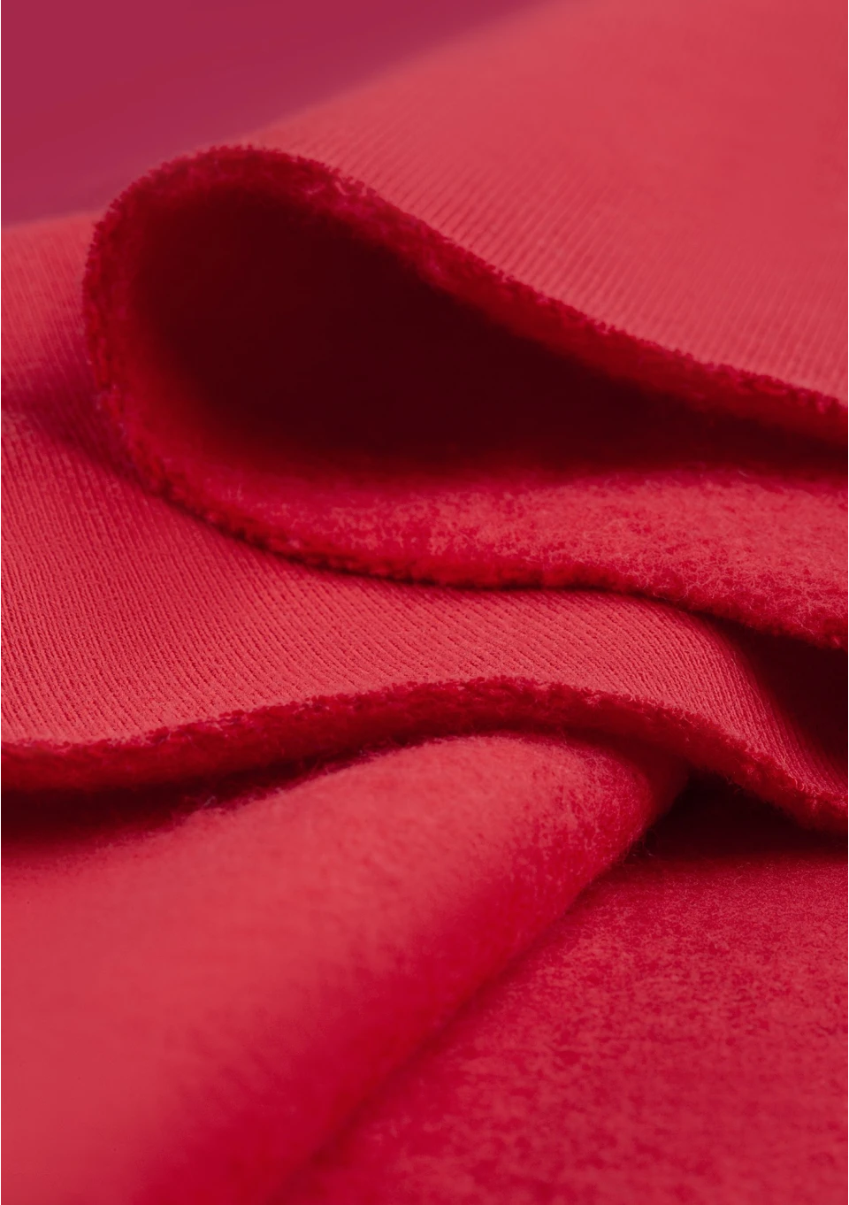 Czerwona bluza oversize z kapturem polskiego projektu. Model z miękkiej dzianiny bawełnianej z przyjemnym meszkiem od spodu.