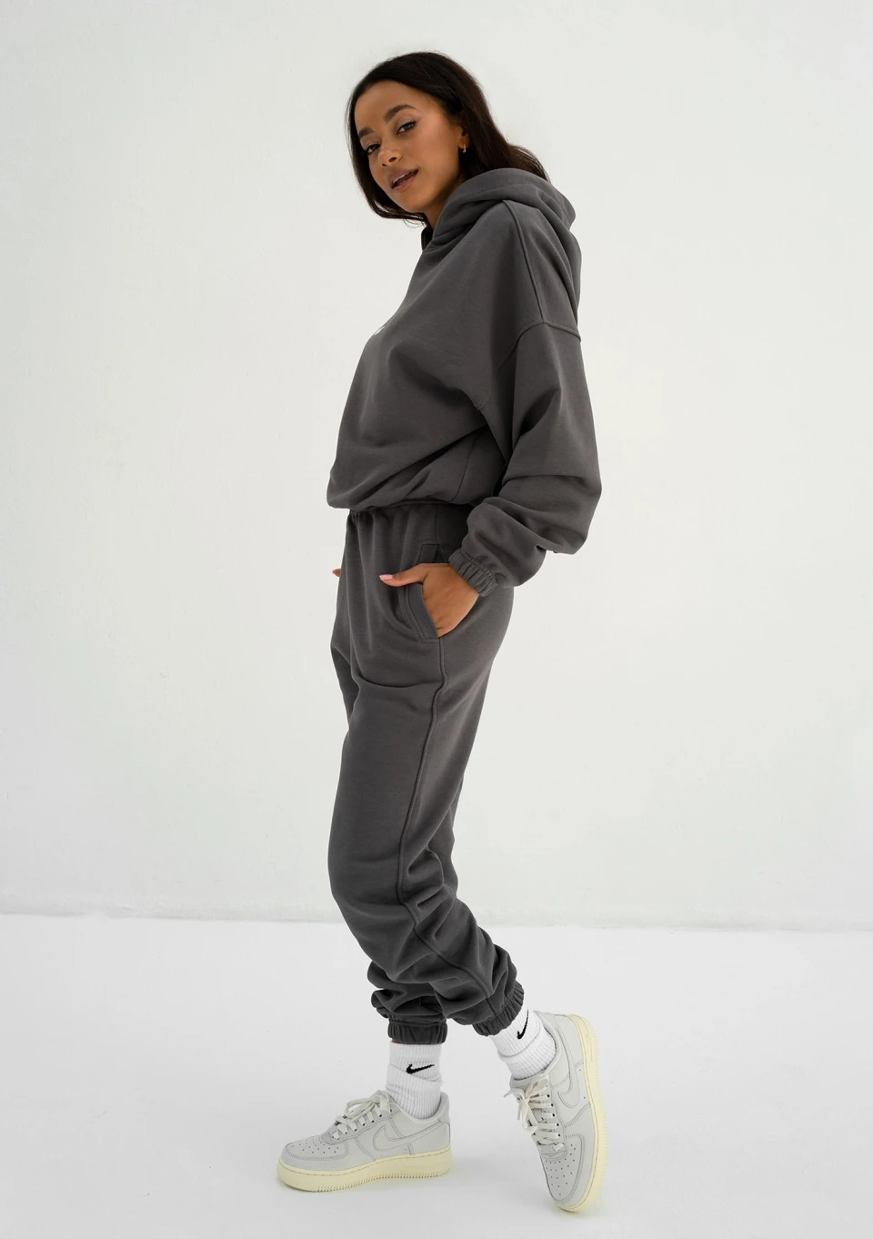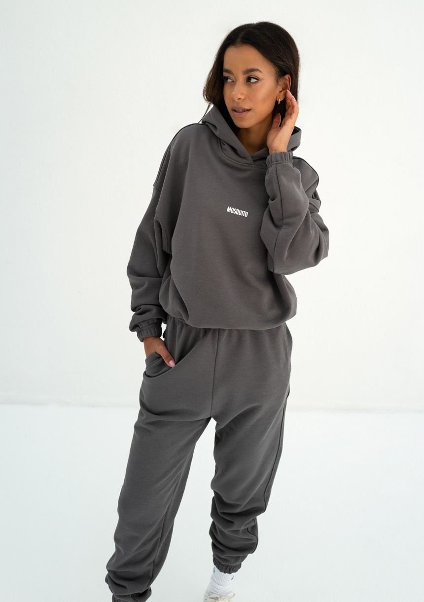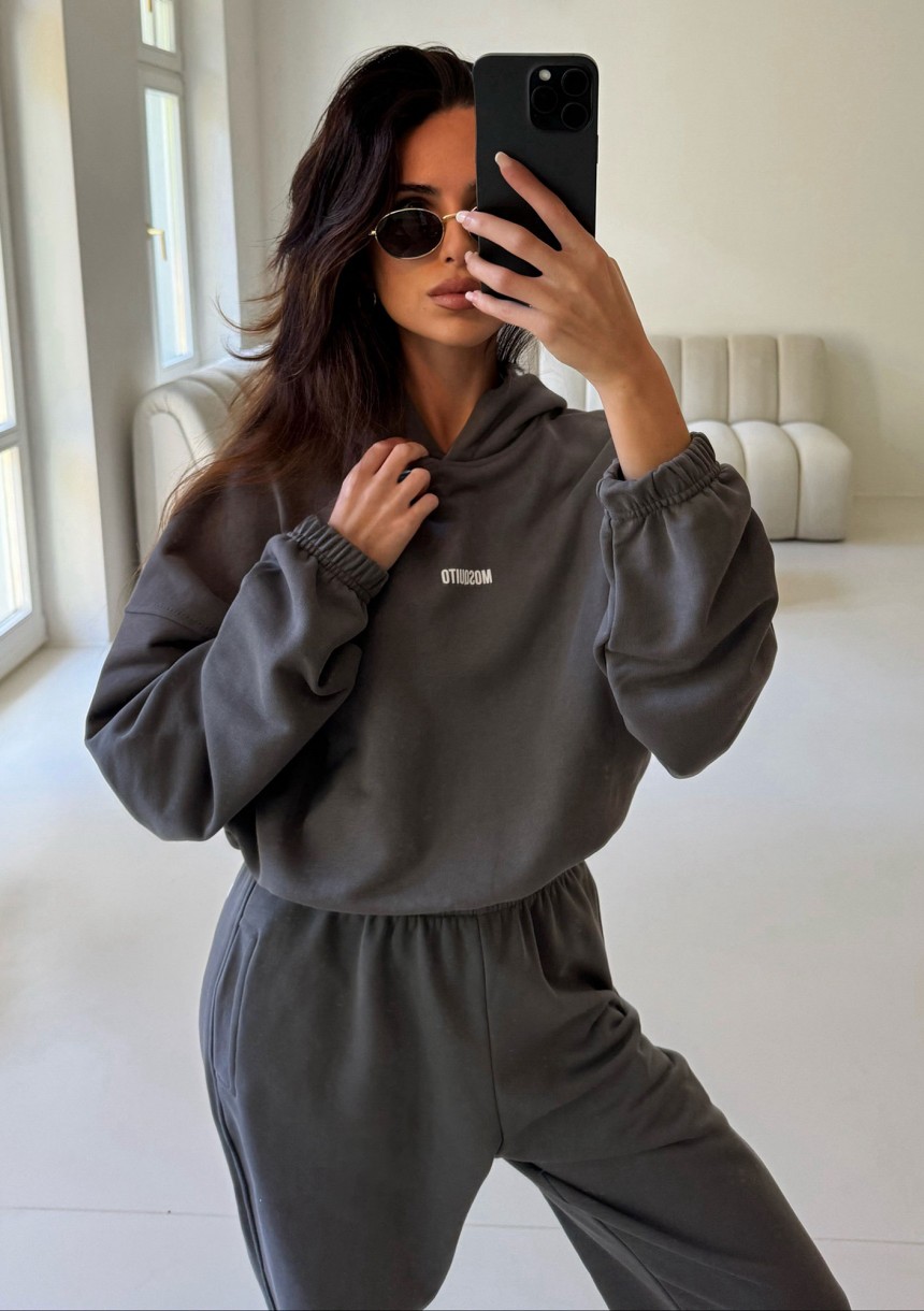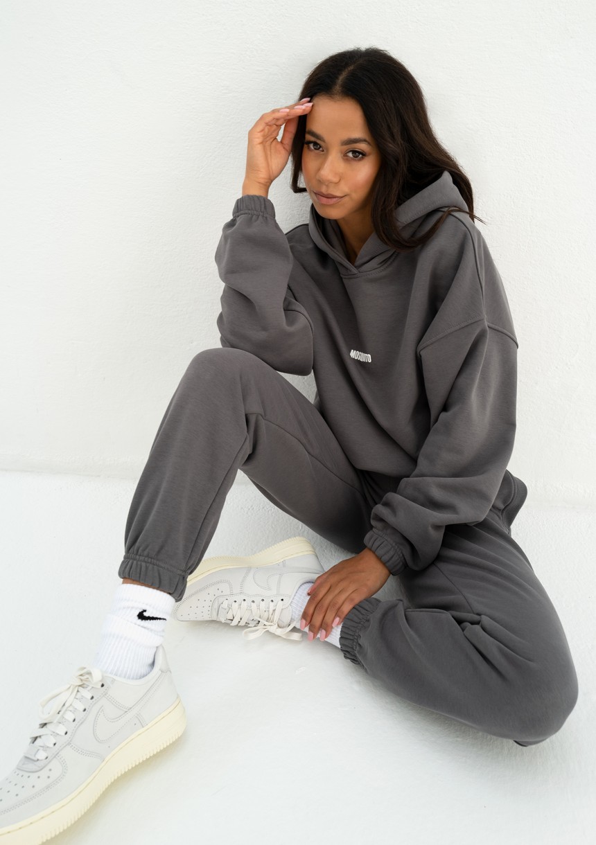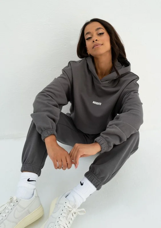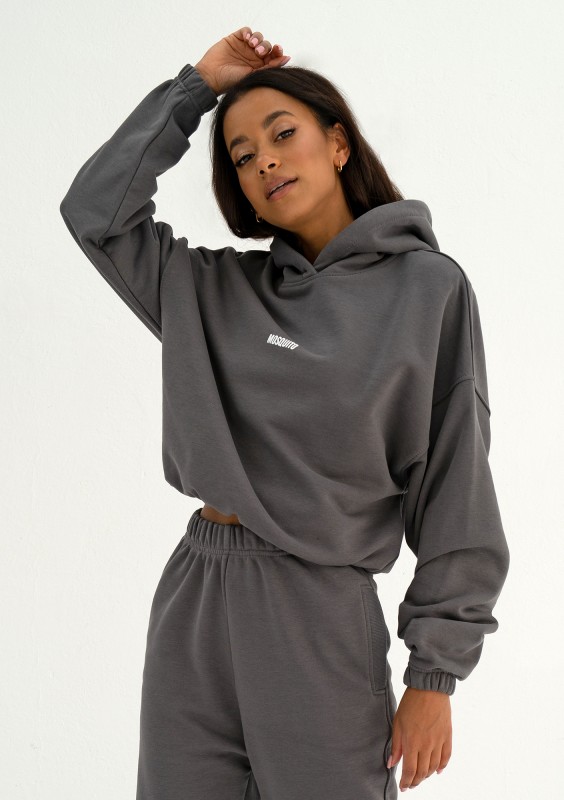 Modna bluza damska wykończona wygodnym ściągaczem i kapturem. Model w uniwersalnym, grafitowym kolorze.