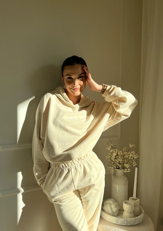 Modna bluza damska wykończona wygodnym ściągaczem i kapturem. Model w bieli o waniliowym tonie, uszyta z dzianiny pętelkowej, bez meszku od spodu. O materiał najlepiej zadbasz stosując nasze zalecenia. Pierz dres wywinięty na spodnią stronę, w delikatnym programie i maksymalnej temperaturze podanej na metce. Ubranie na długo zachwyca pierwotną jakość i zachwycającą miękkość.