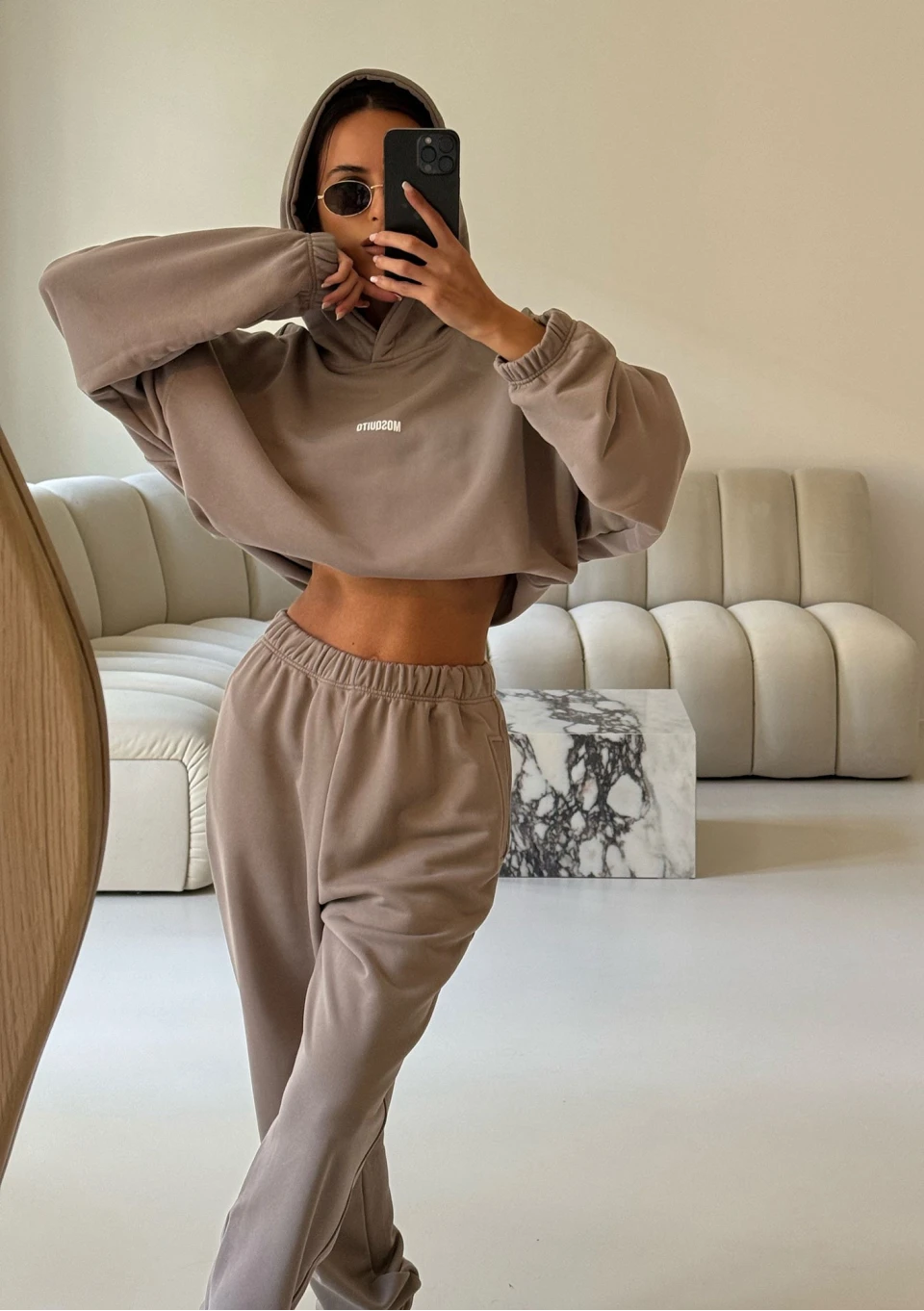 Icon to bluza z kapturem o krótkim kroju, wykończona mocnym ściągaczem. Idealnie układa się na sylwetce! Postaw na uniwersalny kolor taupe.