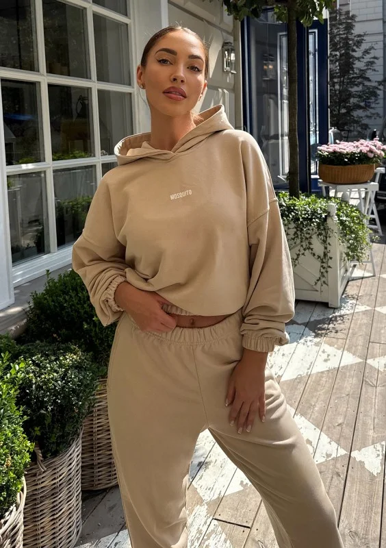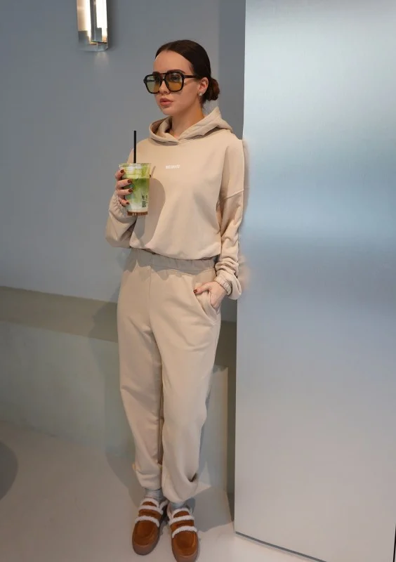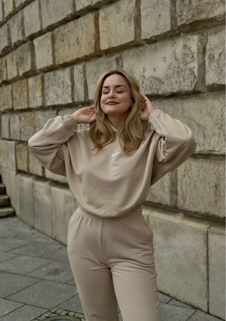 Wygodna bluza dresowa damska z kapturem z logiem marki i elastycznym ściągaczem, dzięki któremu świetnie układa się na sylwetce. Model w piaskowym beżu.