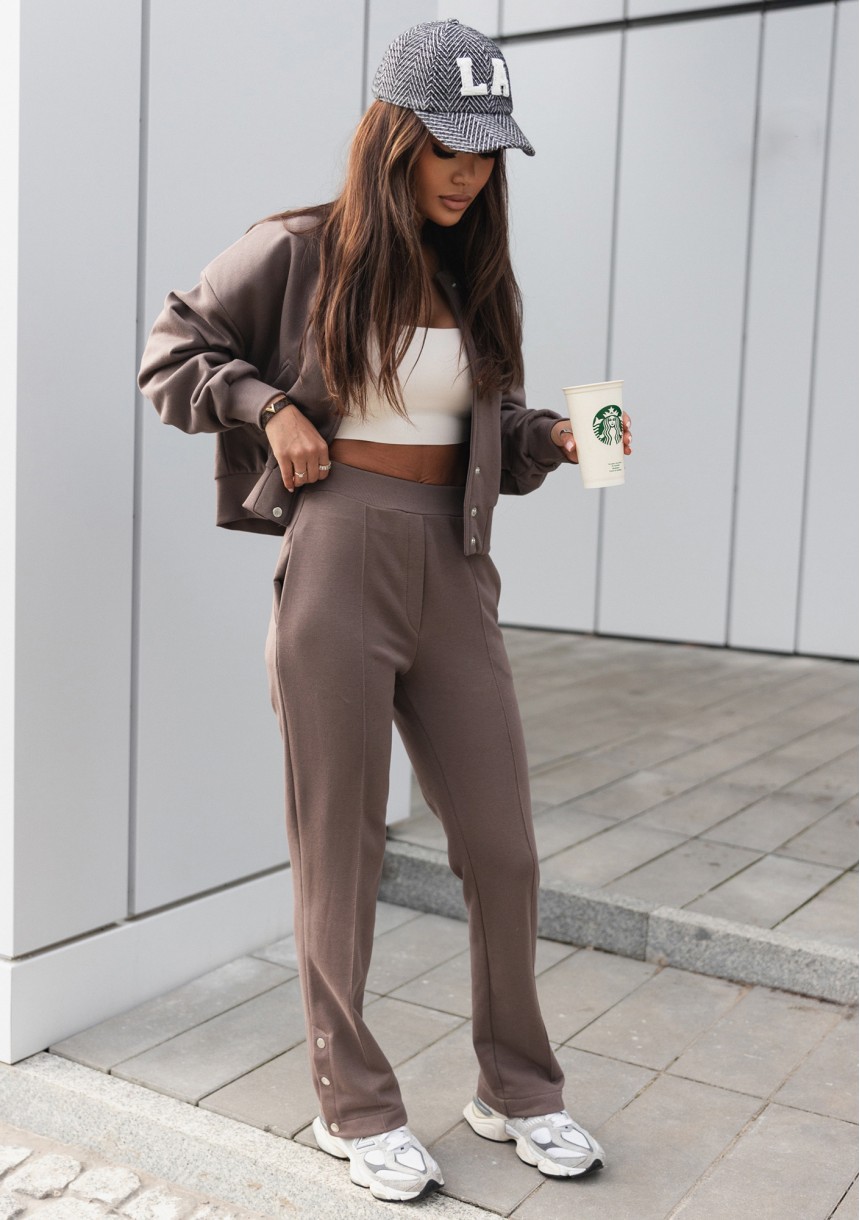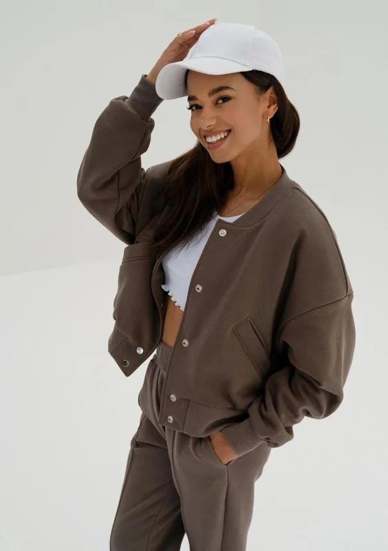 Modna bluza damska o wygodnym kroju typu bomber z metalowymi napami, w brązowym kolorze. Model rodzimej produkcji.