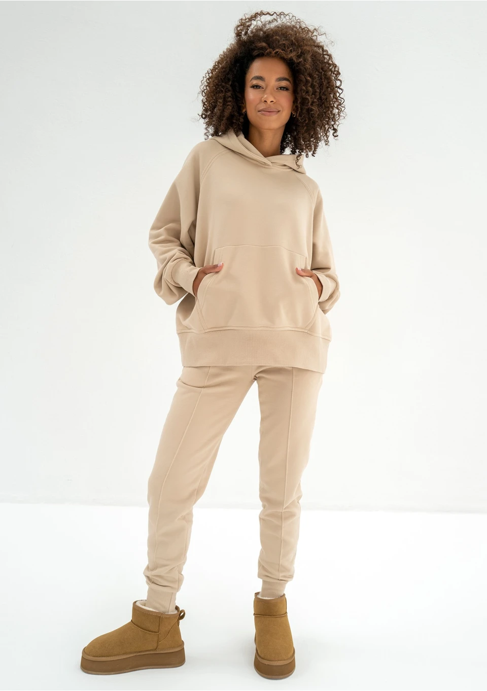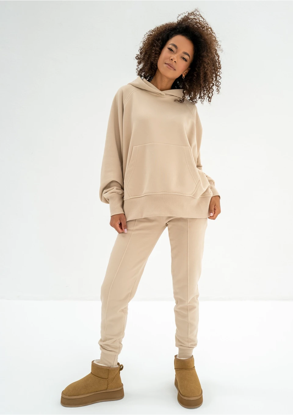 Beżowa bluza kangurka z kapturem dla miłośniczek modnych fasonów oversize. Model z haftowanym na kapturze logiem wykonaliśmy z gęstej, pętelkowej dzianiny bawełnianej.
