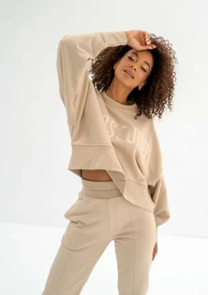 Beżowa bluza damska dresowa wyróżnia się efektownie haftowanym logiem. Posiada krój oversize, dlatego poczujesz się w niej w pełni lekko i wygodnie. Stylowy design uzupełnij spodniami od kompletu, które swoją dopasowaną formą joggerów przełamią swobodnie luźną górę. Nasze dresy damskie są nie tylko projektowane, ale również szyte w Polsce.