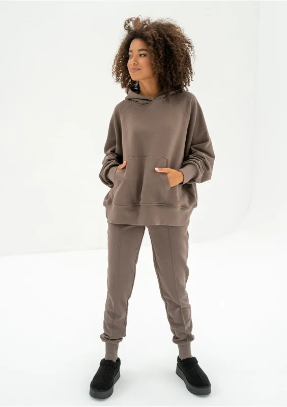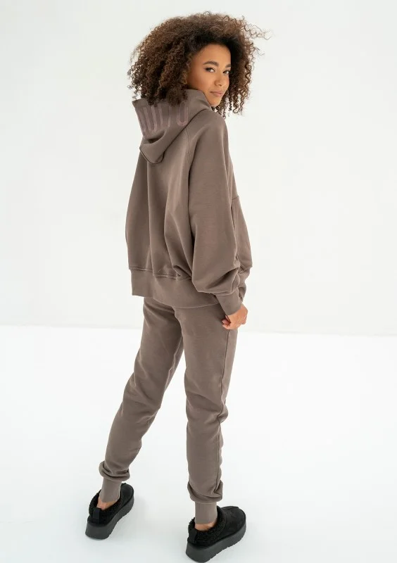 Design bluzy kangurki z kapturem docenią miłośniczki stylu oversize. Model z haftowanym na kapturze logiem wykonaliśmy z gęstej, pętelkowej dzianiny w brązowym odcieniu.