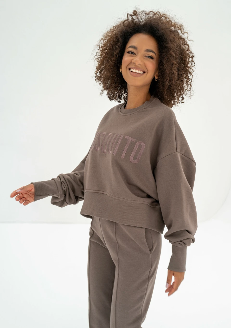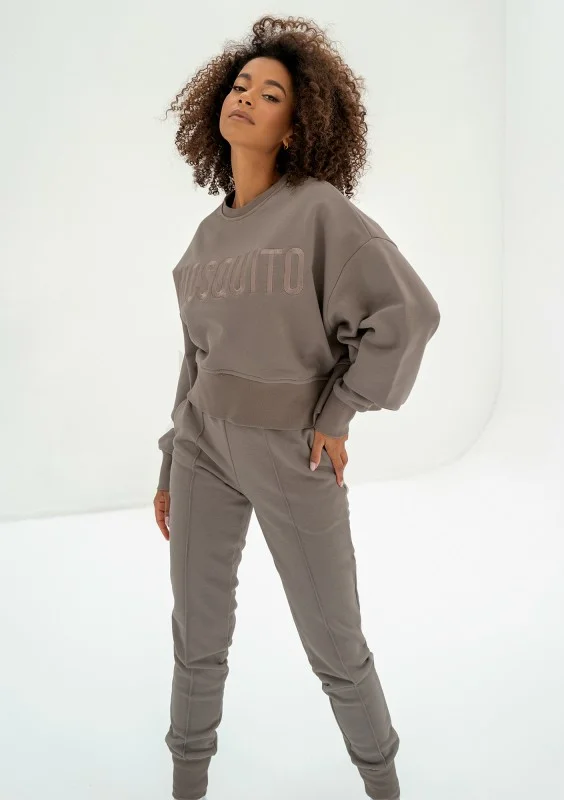 Bawełniana bluza damska dresowa bez meszku w brązowym kolorze Savannah Tan. Oversizowy model ozdobiliśmy pięknie haftowanym logiem.