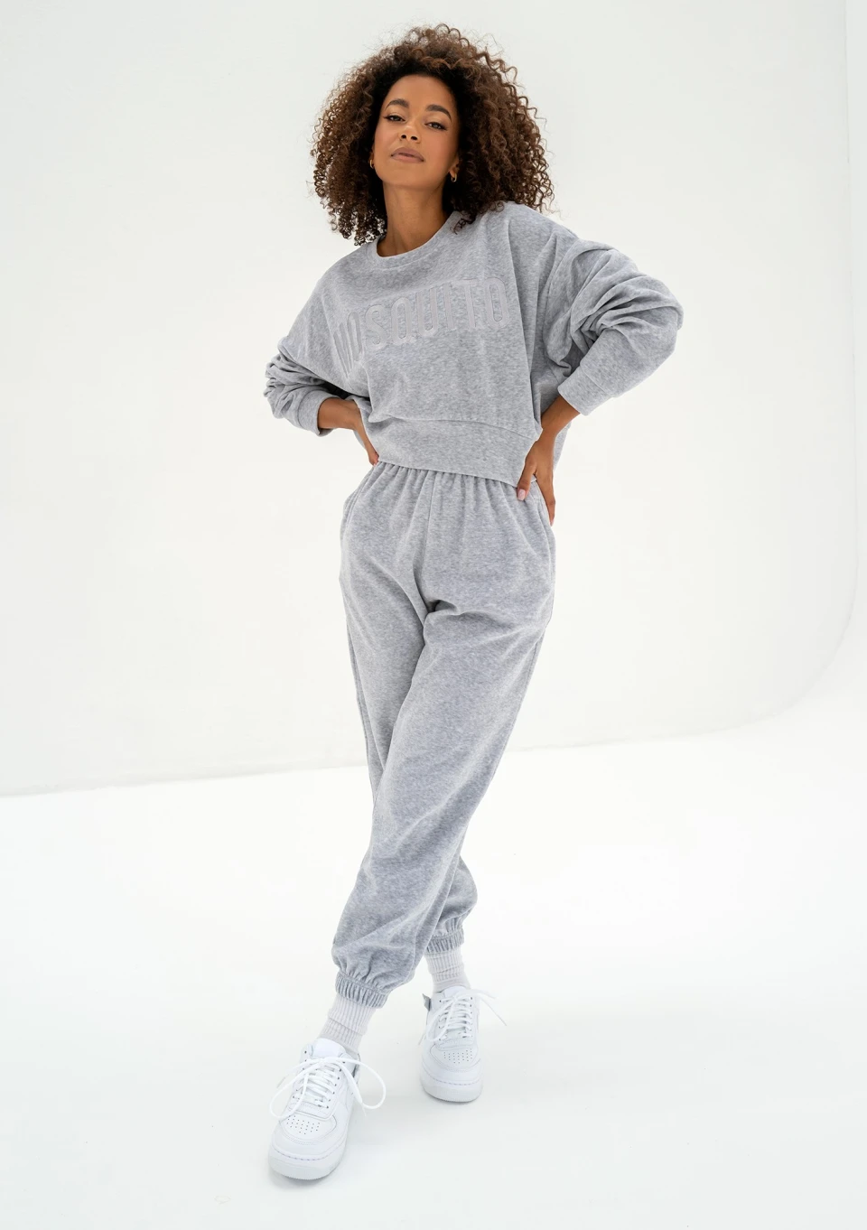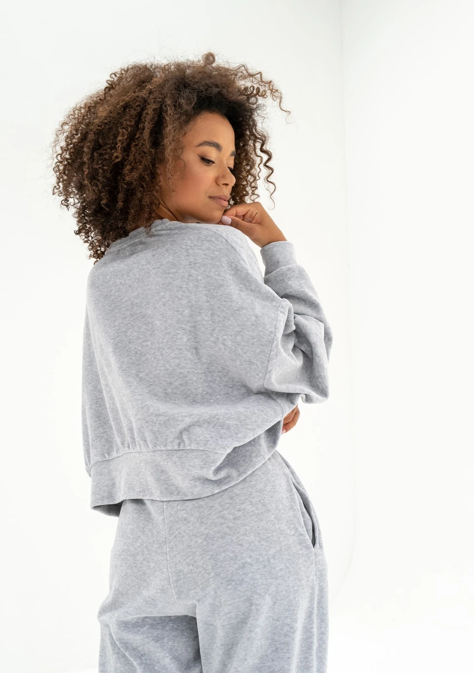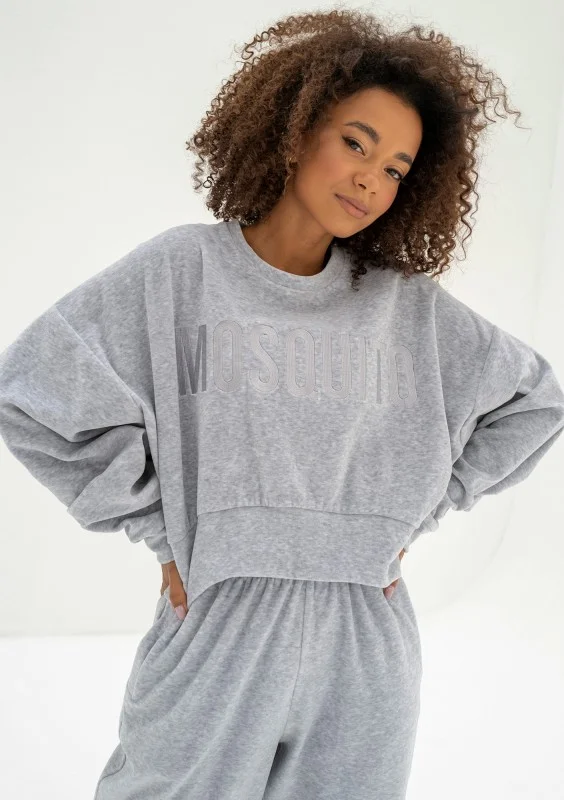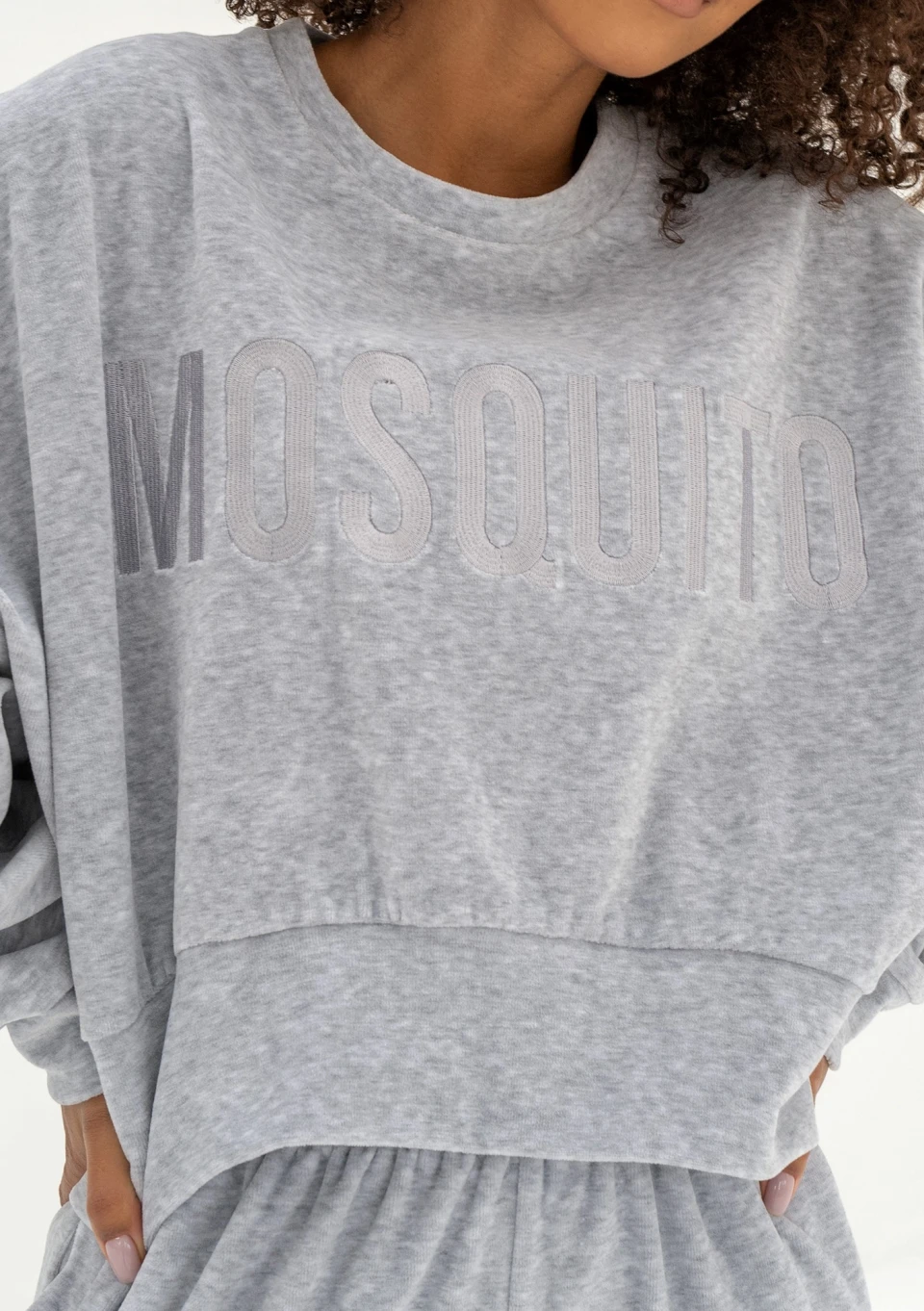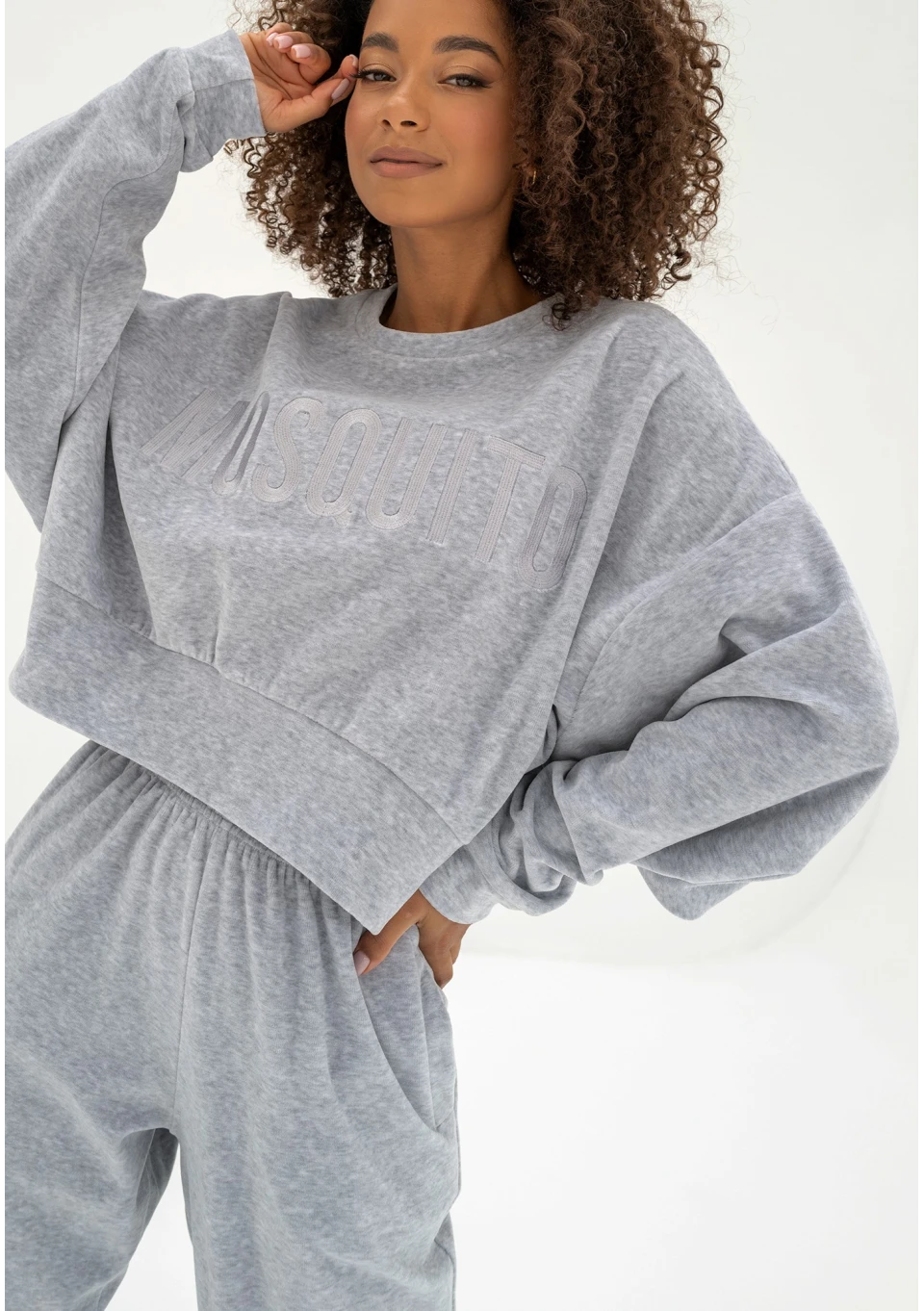 Szara bluza damska o krótkim i swobodnym kroju oversize. Idealna dla miłośniczek miękkiego weluru i efektownych detali. Zwraca uwagę przepięknie wyhaftowanym logiem.
