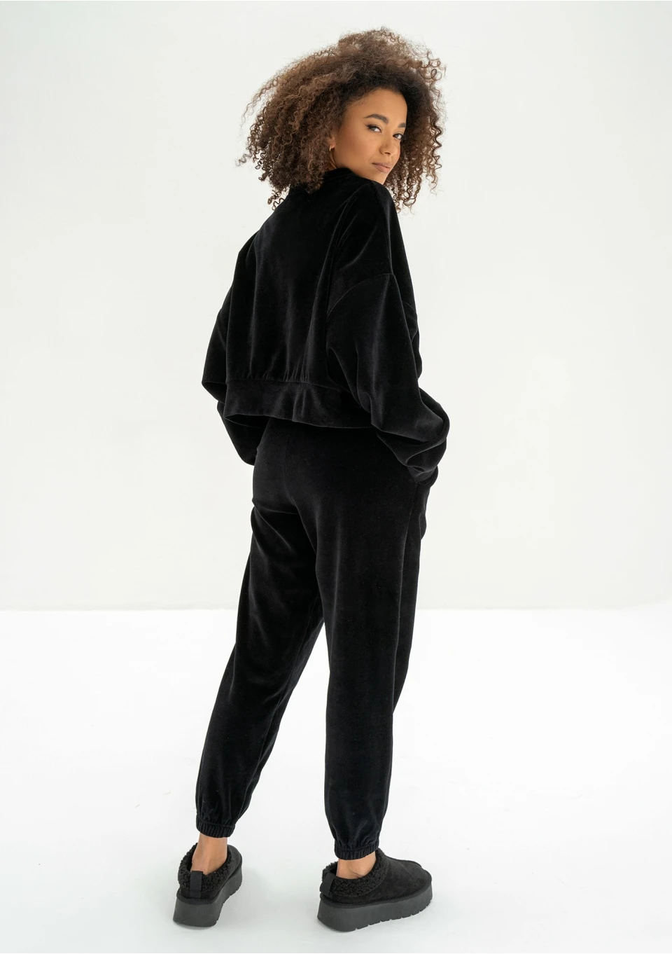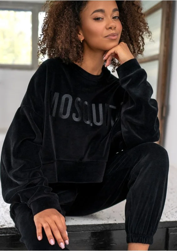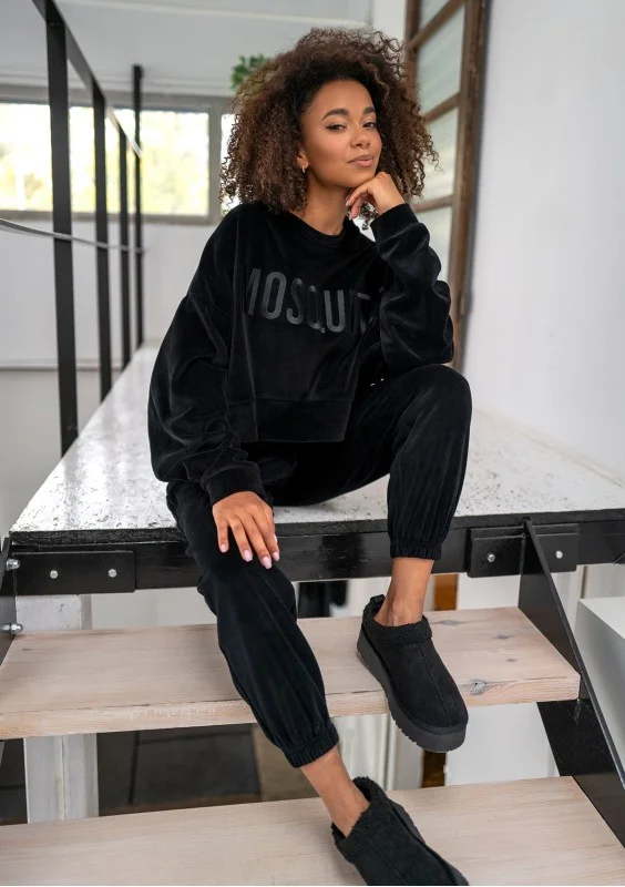 Czarna bluza damska o krótkim i swobodnym kroju oversize. Oczaruje każdą miłośniczkę miękkiego weluru i efektownych detali. Model z przepięknie wyhaftowanym logiem.