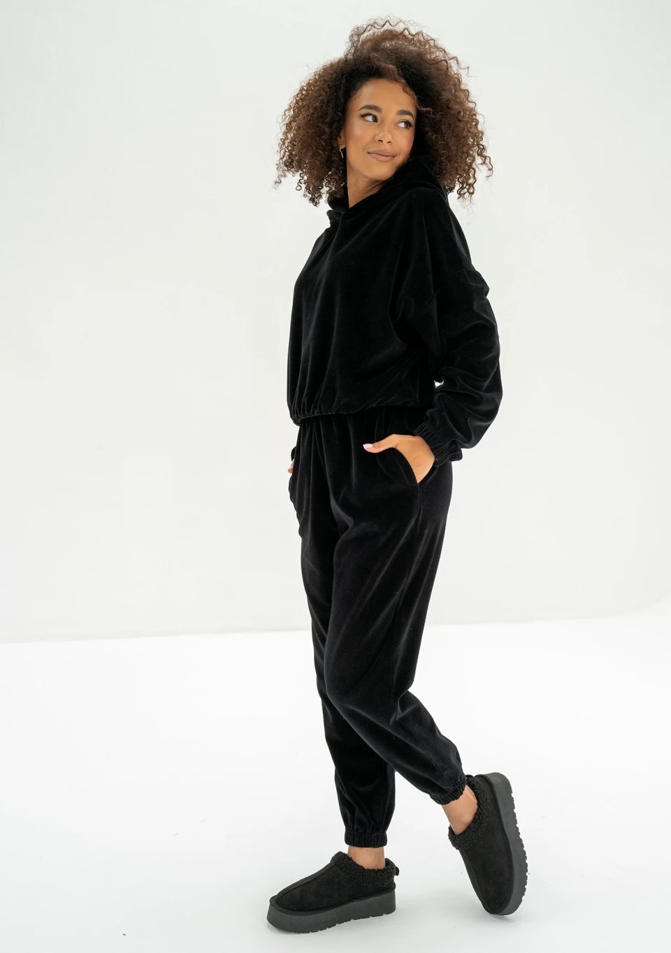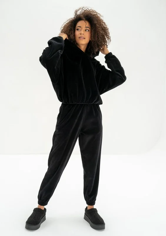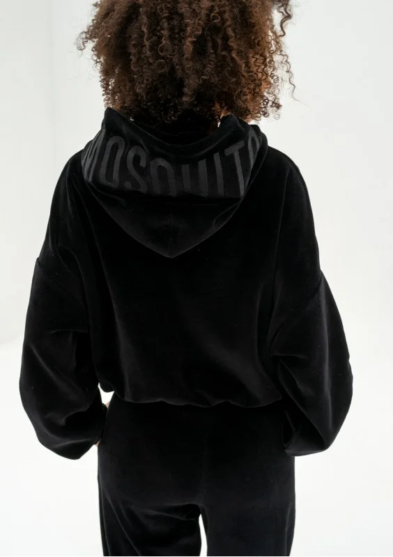 Czarna bluza damska z kapturem z weluru. Miękka i lśniąca dzianina bawełniana. Model z wyjątkowym, haftowanym na kapturze logiem.