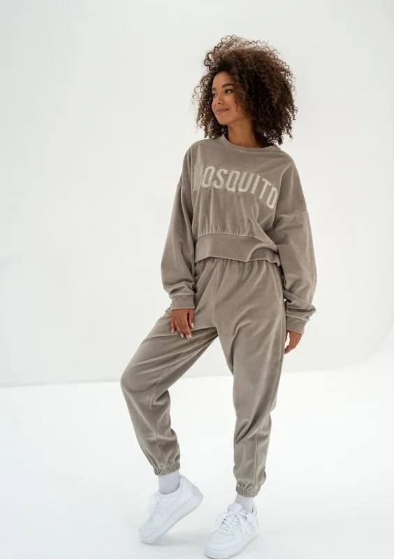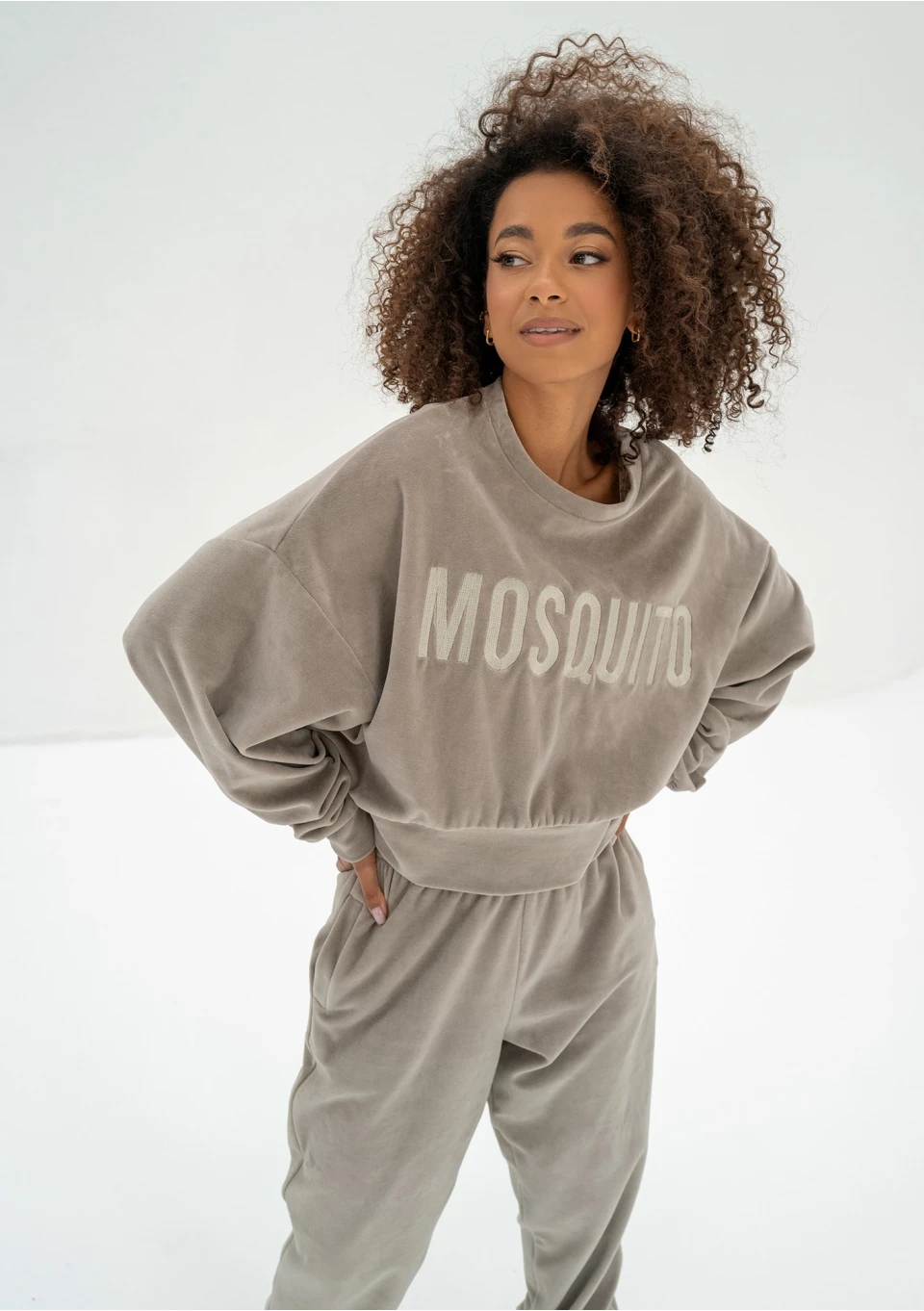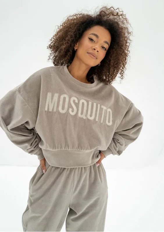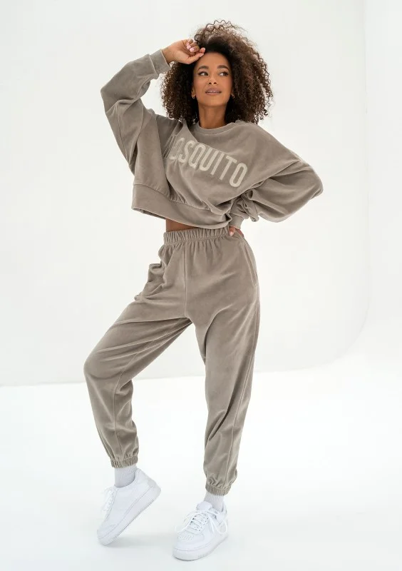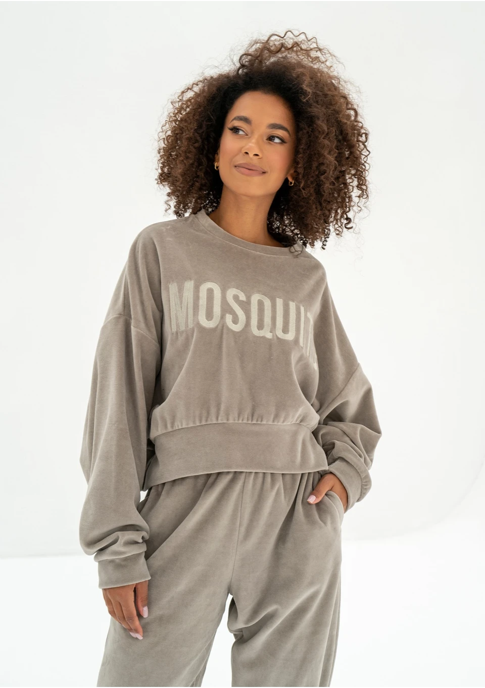 Welurowa bluza damska o krótkim i swobodnym kroju oversize. Idealna dla miłośniczek miękkiej faktury. Model z haftem naszego loga, w kolorze taupe.