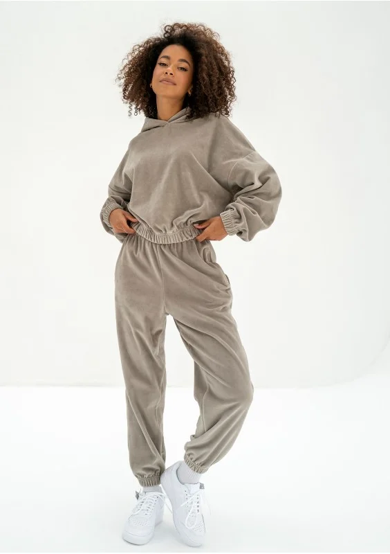 Wybierz welurowy dres damski w eleganckim kolorze taupe. Z łatwością dobierzesz pasujące dodatki! Bluza prezentowana przez naszą modelkę Jackie ma delikatnie motylkowy krój - jest luźna, ale krótka, dzięki czemu odrobinę podkreśla sylwetkę. Model jest wykończony na dole ściągającą gumką.
