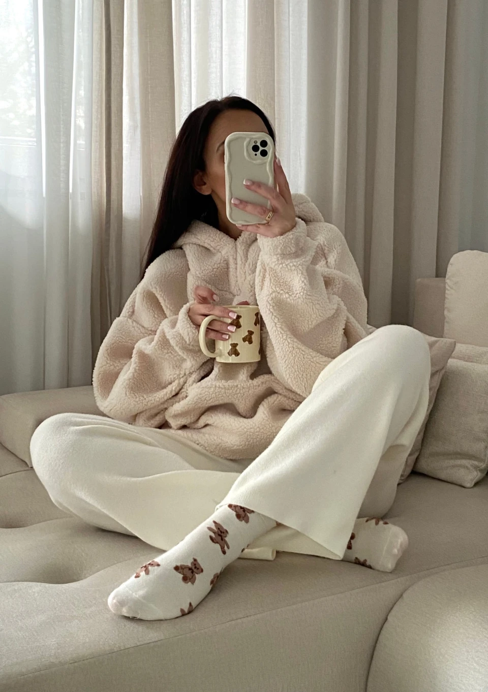 Ciepła, miękka bluza damska z baranka w stylu comfy. Oversizowy fason z kieszenią i kapturem, wykonany w naturalnym, beżowym odcieniu.