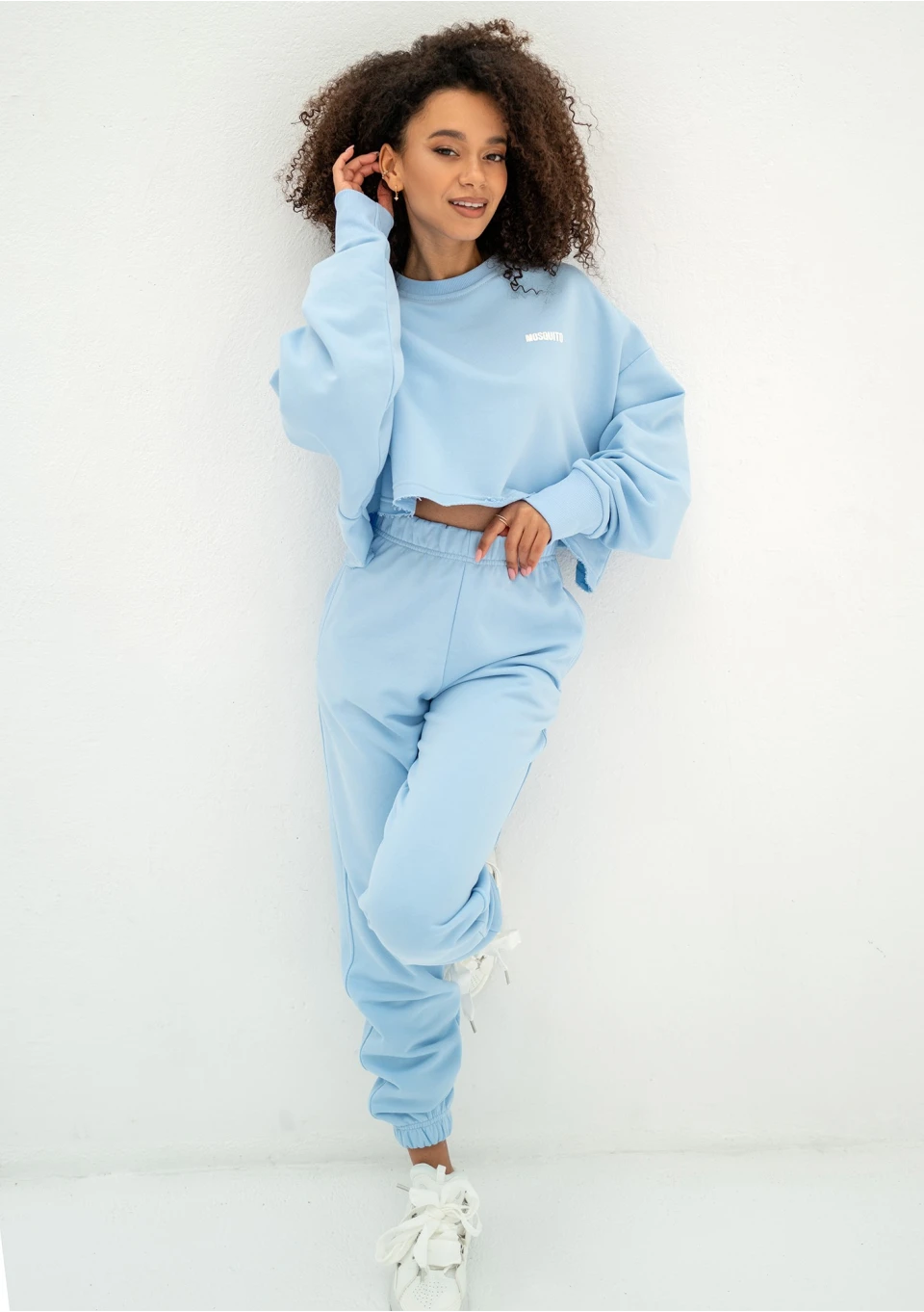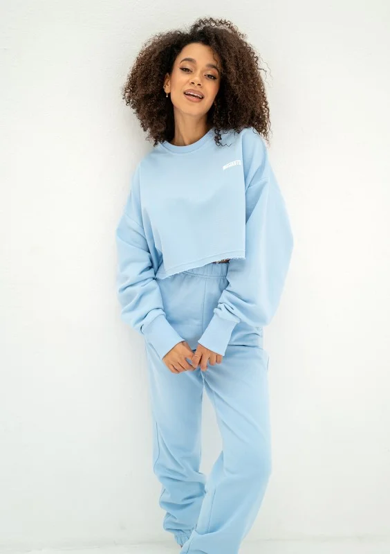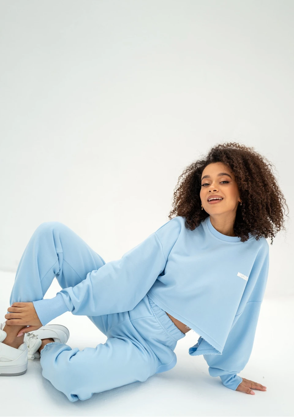 Stylowa, lekka bluza damska crop na wiosnę i lato, wykonana z dzianiny pętelkowej w pastelowym błękicie Baby Blue. Design oversize, podkreślony białym logiem.