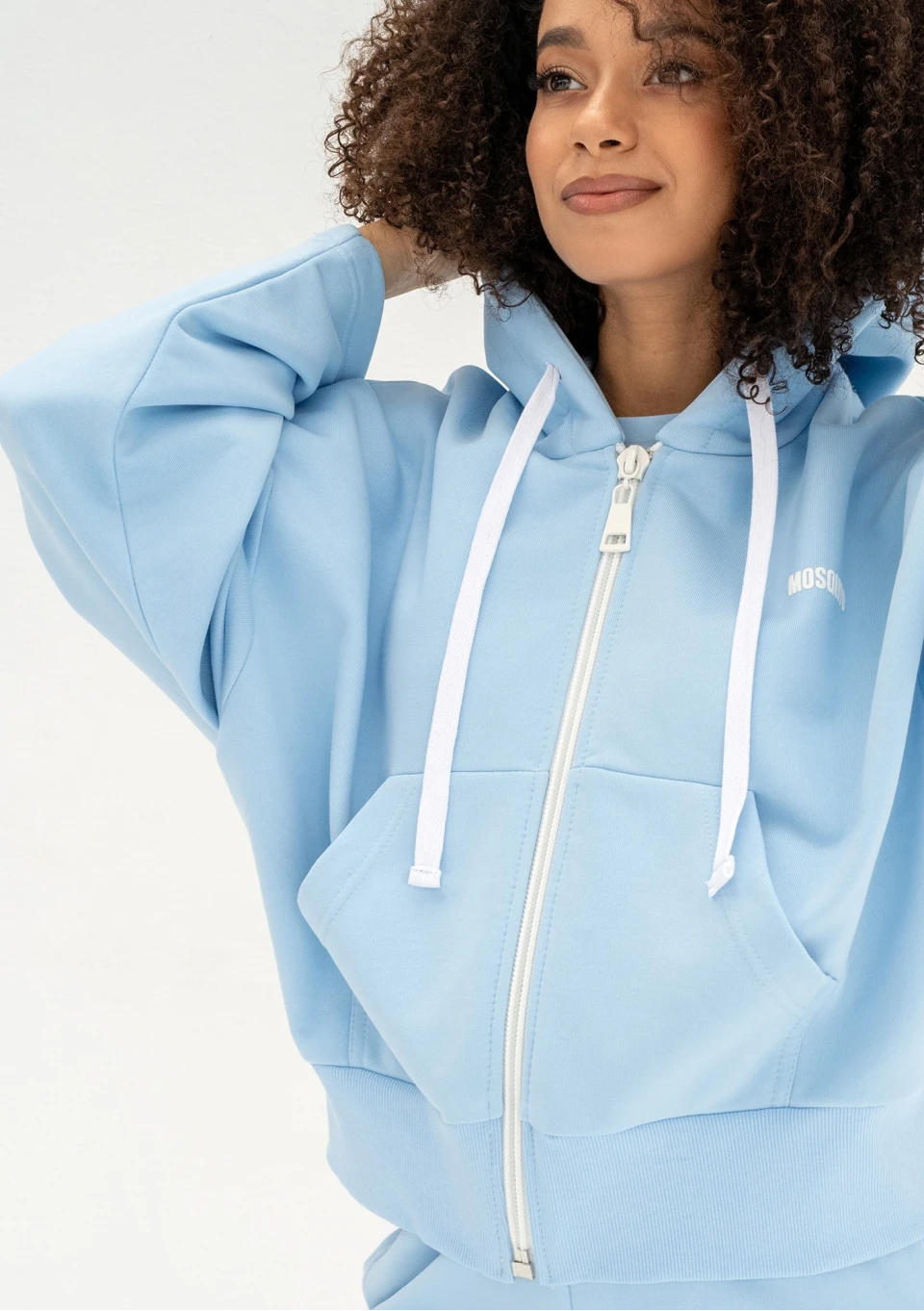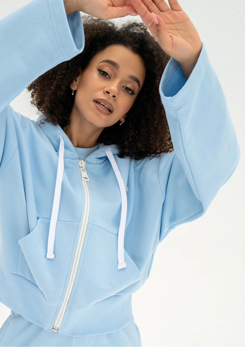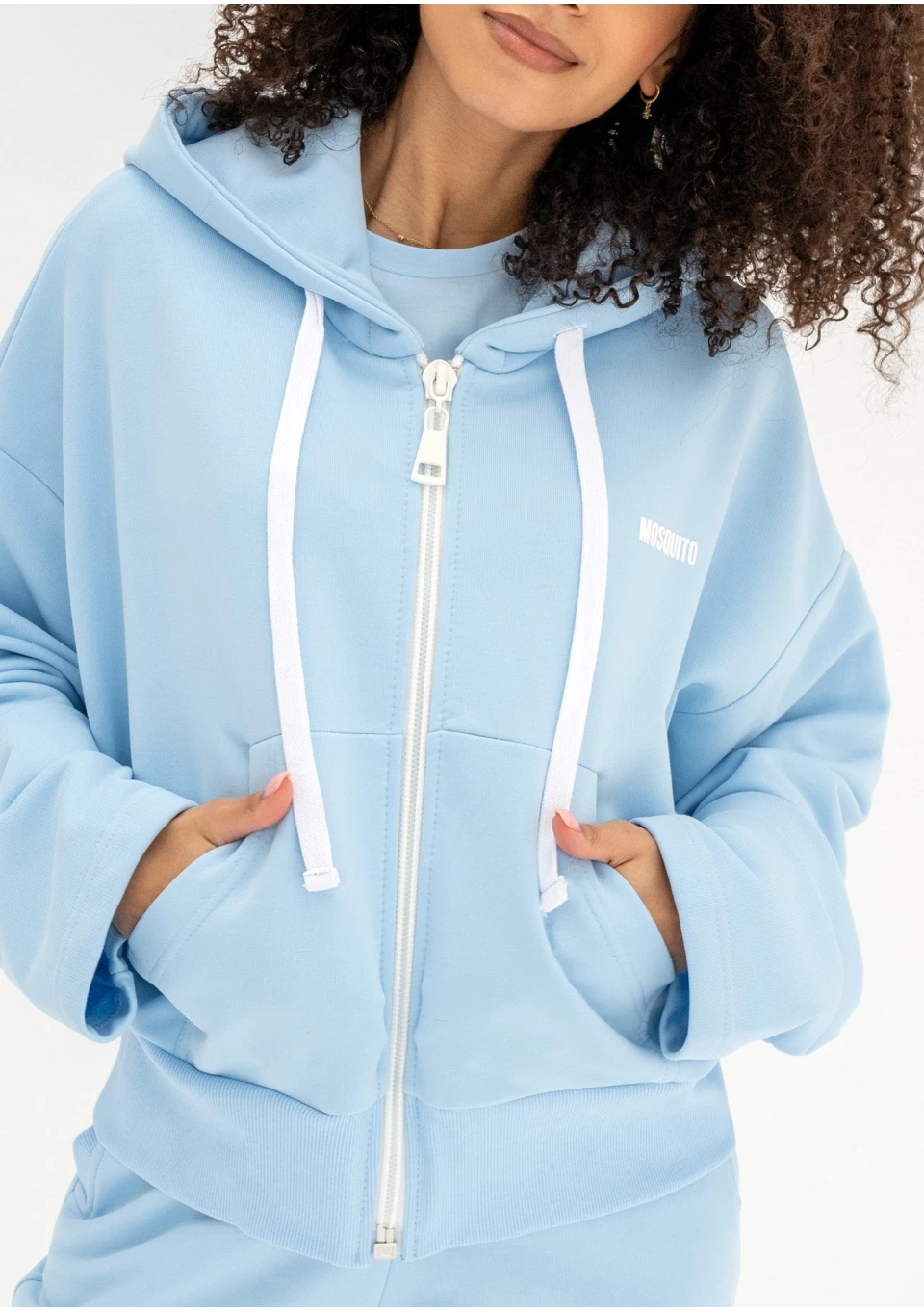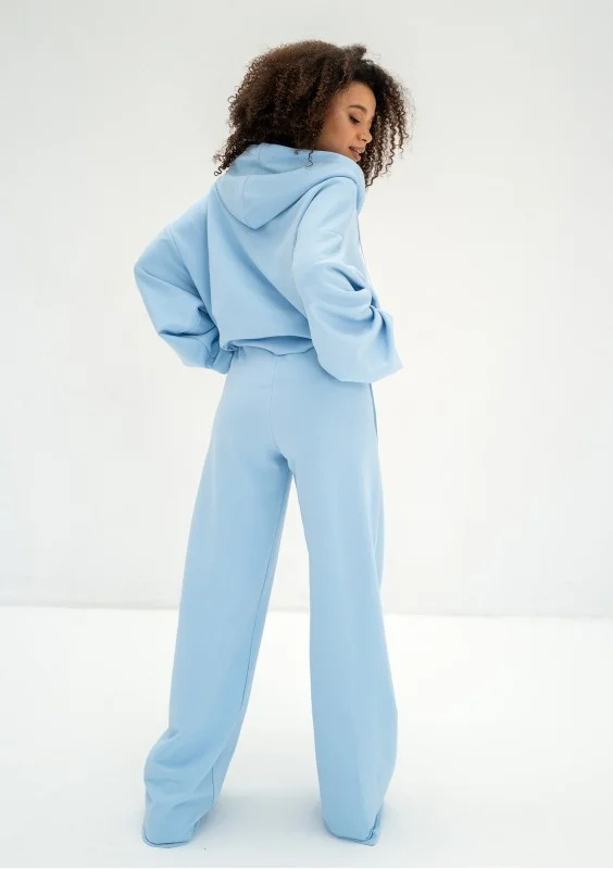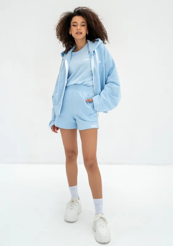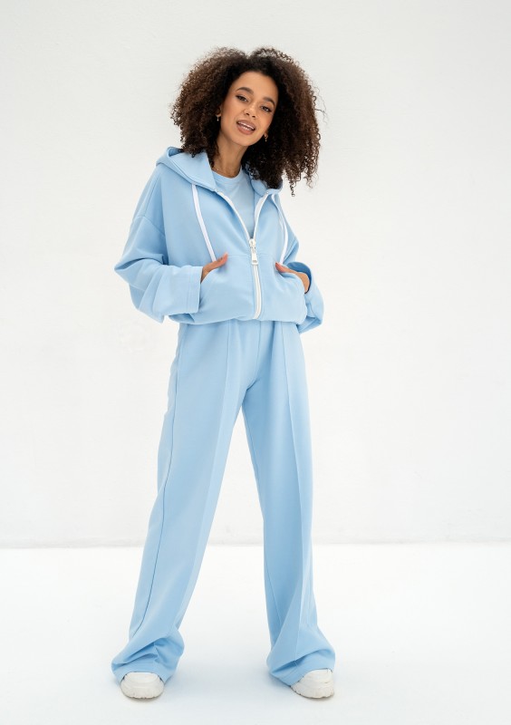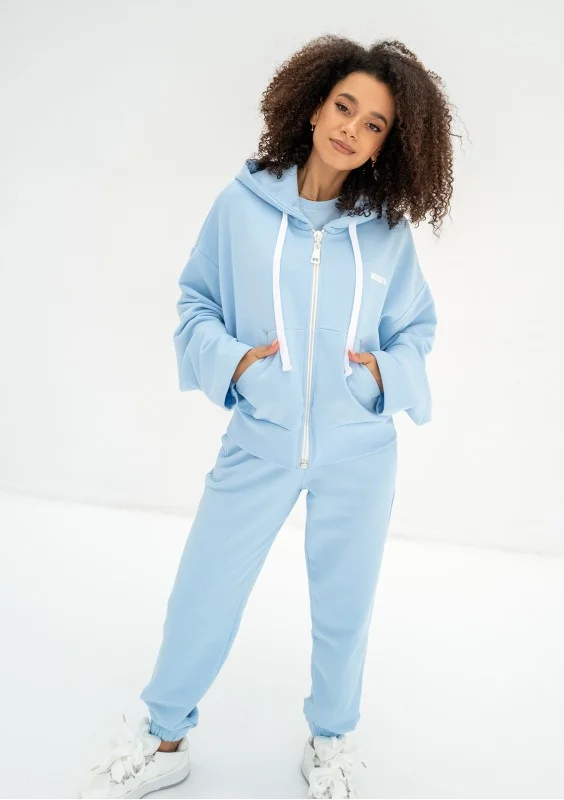 Błękitna bluza damska o modnym kroju oversize. Funkcjonalnie zapinana zamkiem i wyposażona w kaptur z troczkami oraz kieszenie.