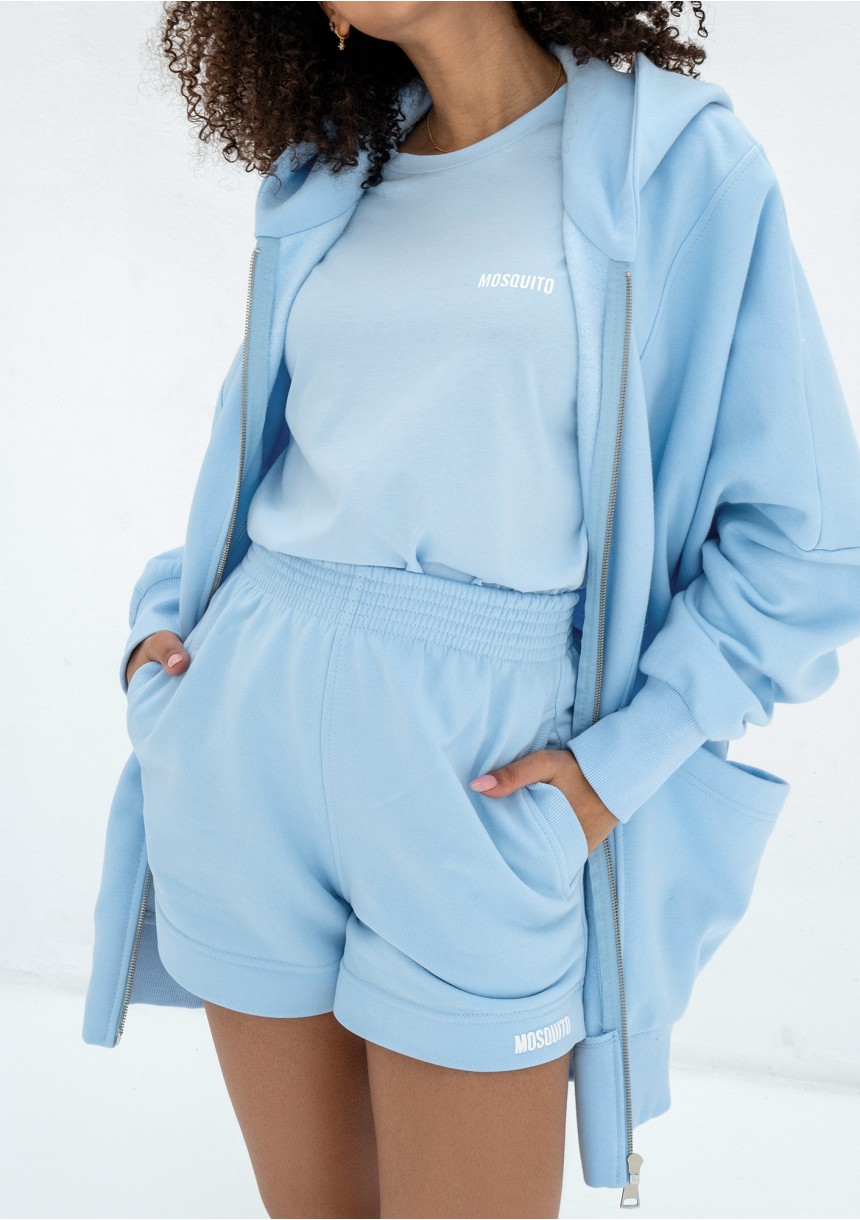 Błękitna bluza damska z kapturem, zachowana w najmodniejszej estetyce oversize. Podkreślona logiem w formie naszywki na jednej z kieszeni.
