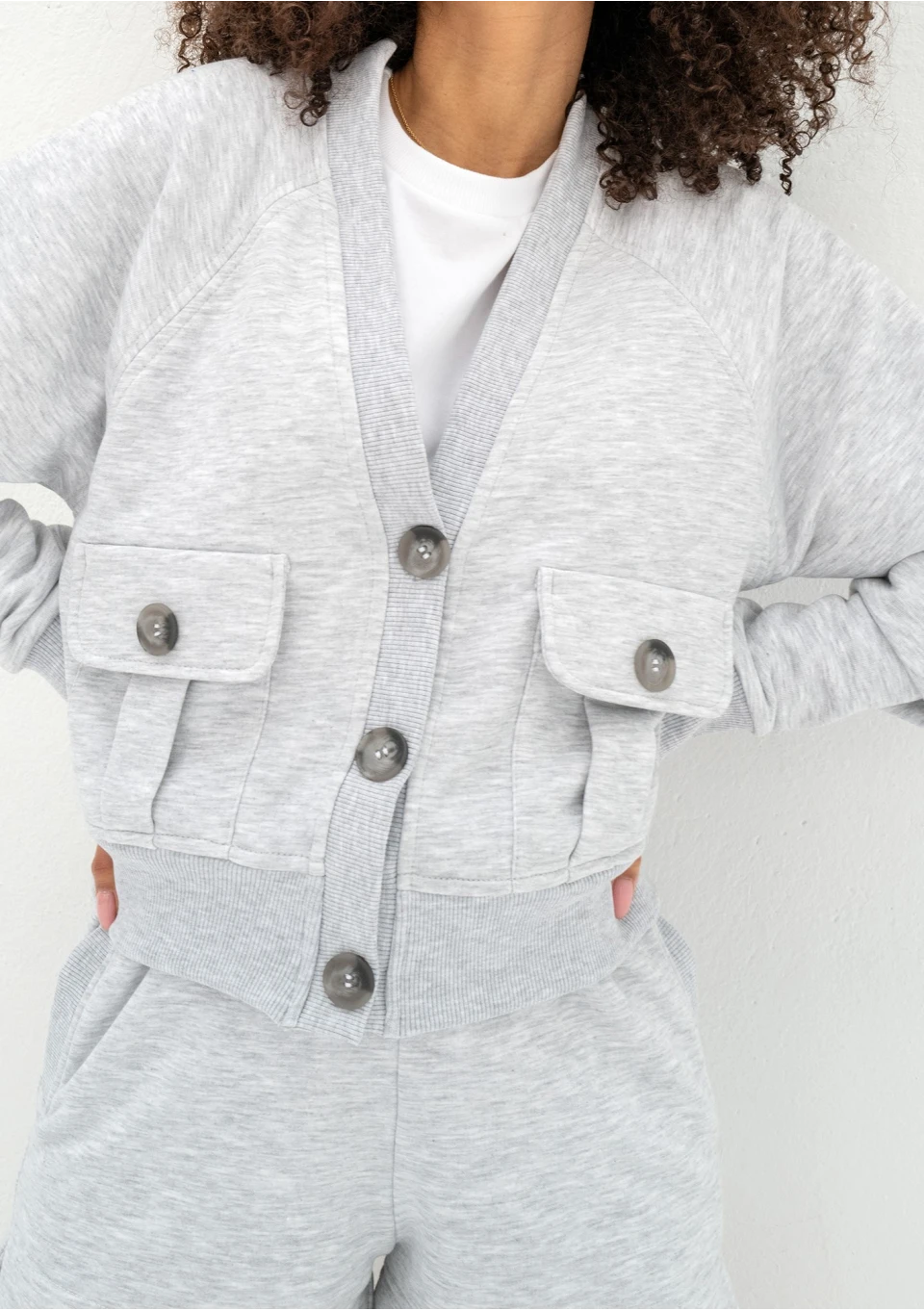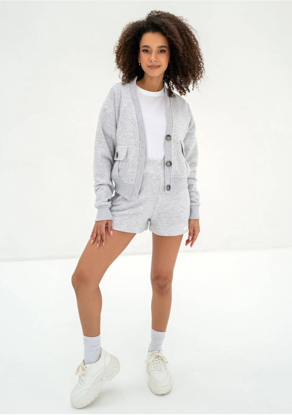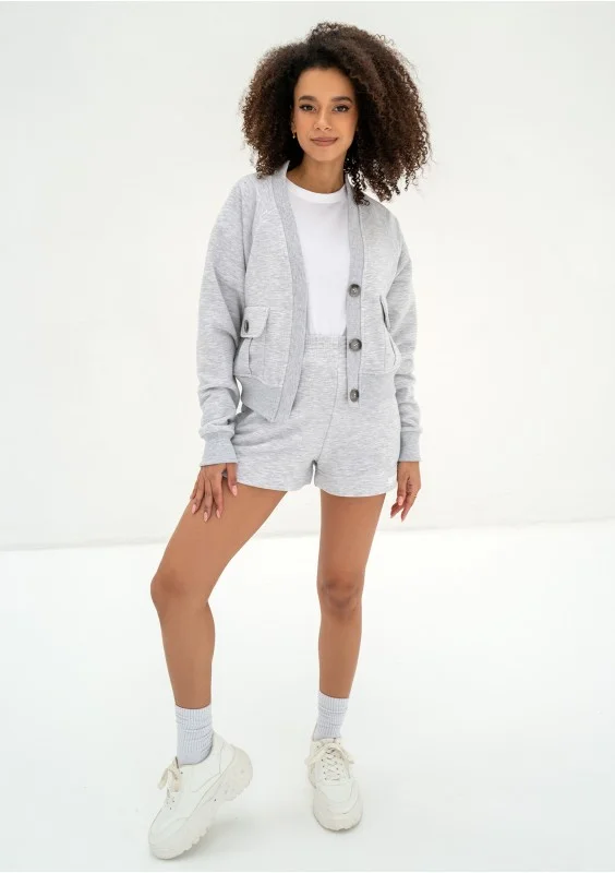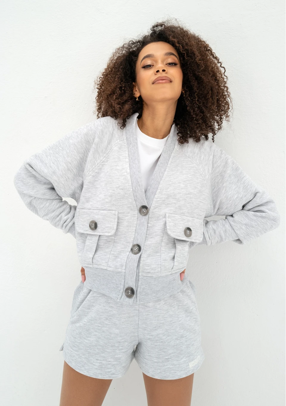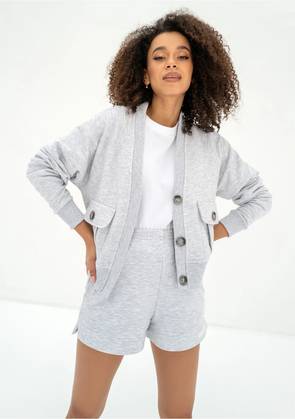 Szary kardigan damski wykonany z miękkiej dzianiny dresowej. Wykończony wygodnymi ściągaczami i wzbogacony praktycznymi kieszeniami.