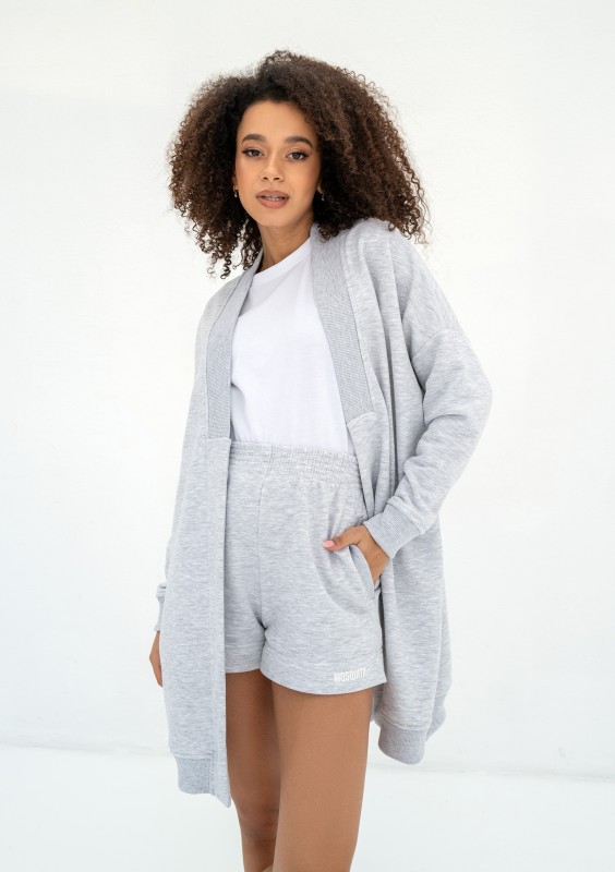 Ten szary kardigan dresowy to nadająca się do ekspresowego założenia narzutka, idealna na szybkie wyjście i spacer. Delikatny, melanżowy odcień szarości stanowi uniwersalną bazę stylizacji. Model został uszyty z miękkiej dzianiny bawełnianej z drobnym dodatkiem poliestru. Materiał zapewnia wrażenie miękkości i przyjemnej w dotyku struktury. Produkt zaprojektowany i uszyty w Polsce.