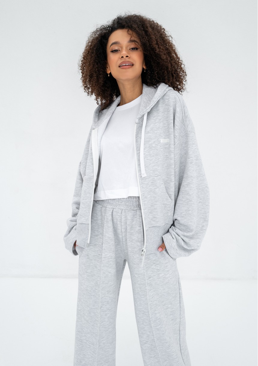 Modna bluza damska w jasnoszarym kolorze. Zaprojektowana w formie oversize. Wygodna w użytkowaniu dzięki zapięciu na zamek, posiada także kaptur z regulowanymi sznurkami oraz praktyczne kieszenie.