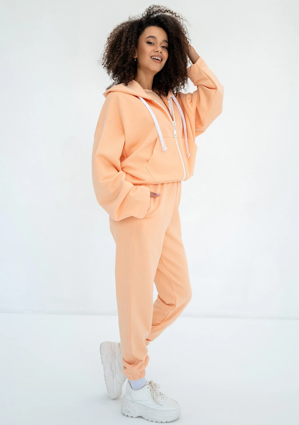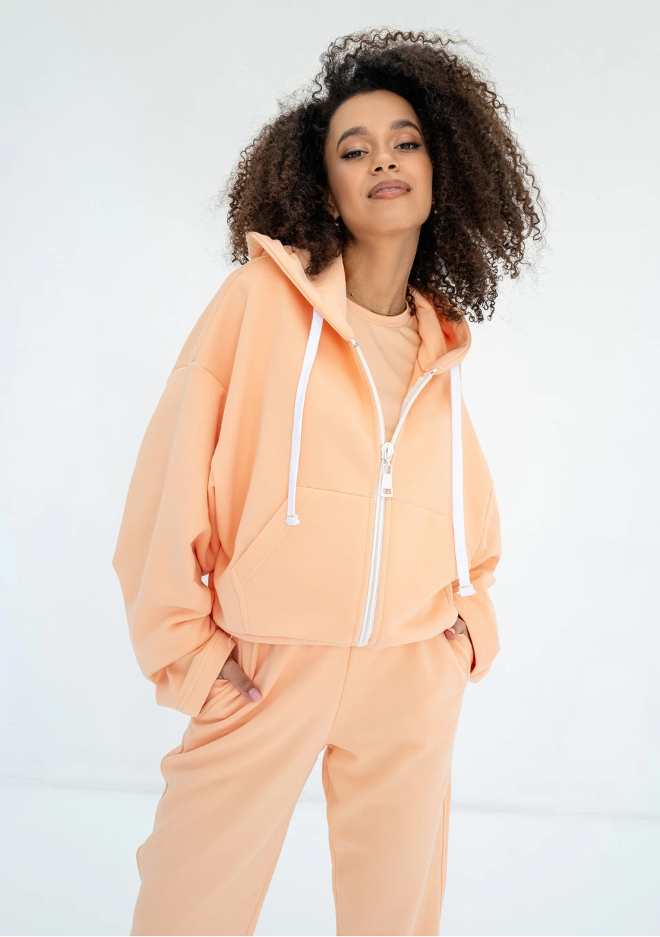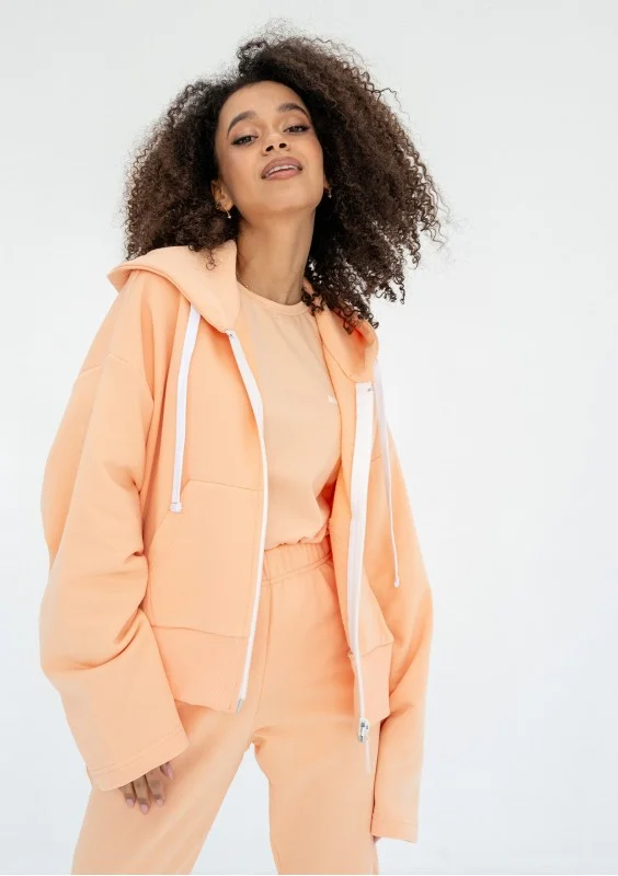 Rozpinana bluza damska o modnym kroju oversize. Wyposażona w kaptur z troczkami oraz kieszenie. Model w jasnym, pomarańczowym kolorze.