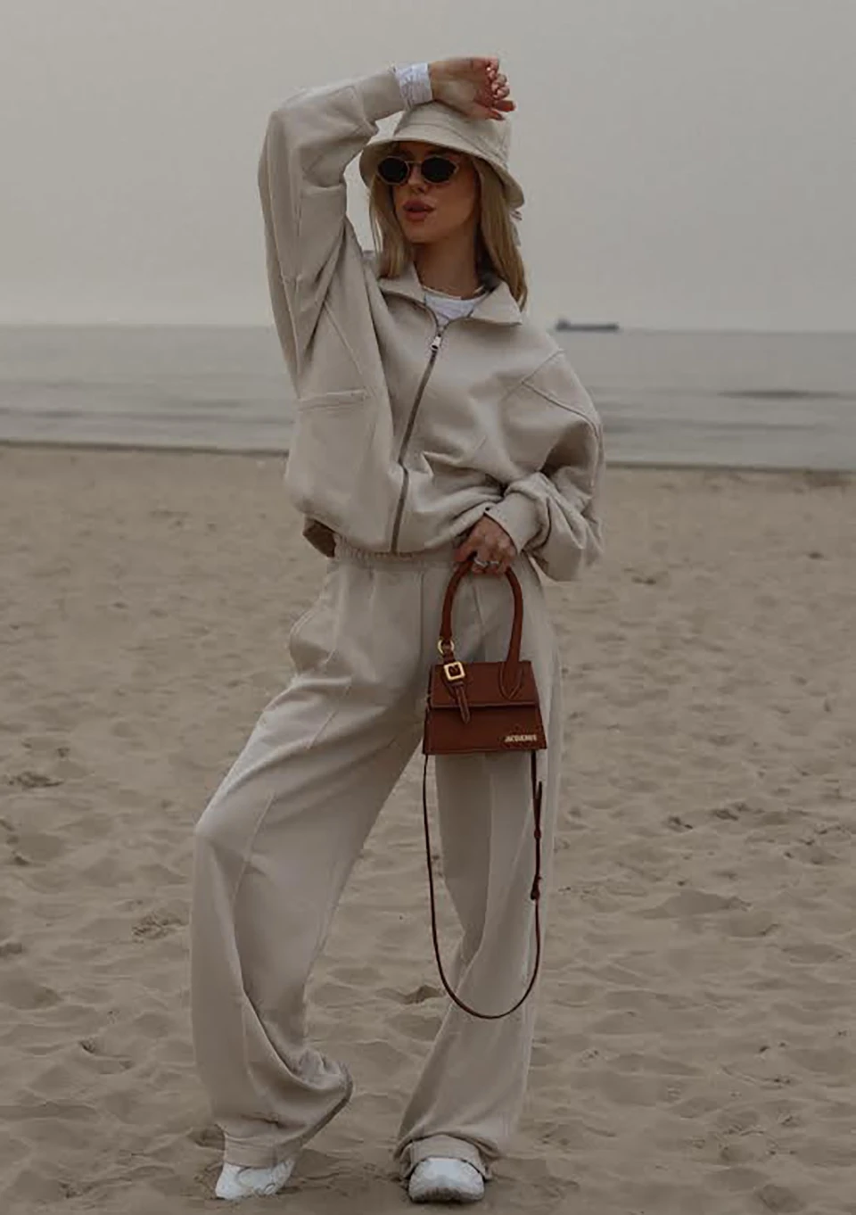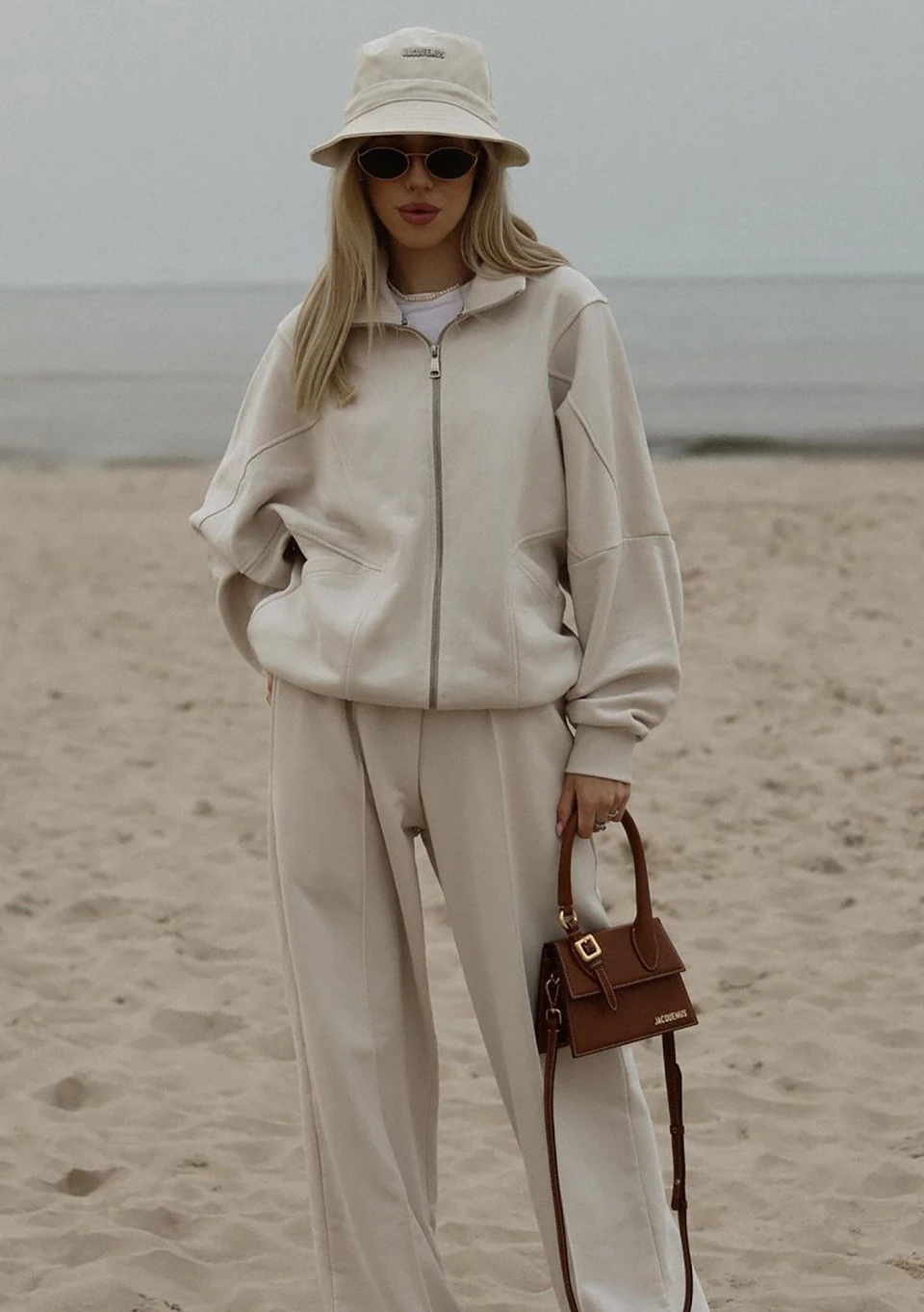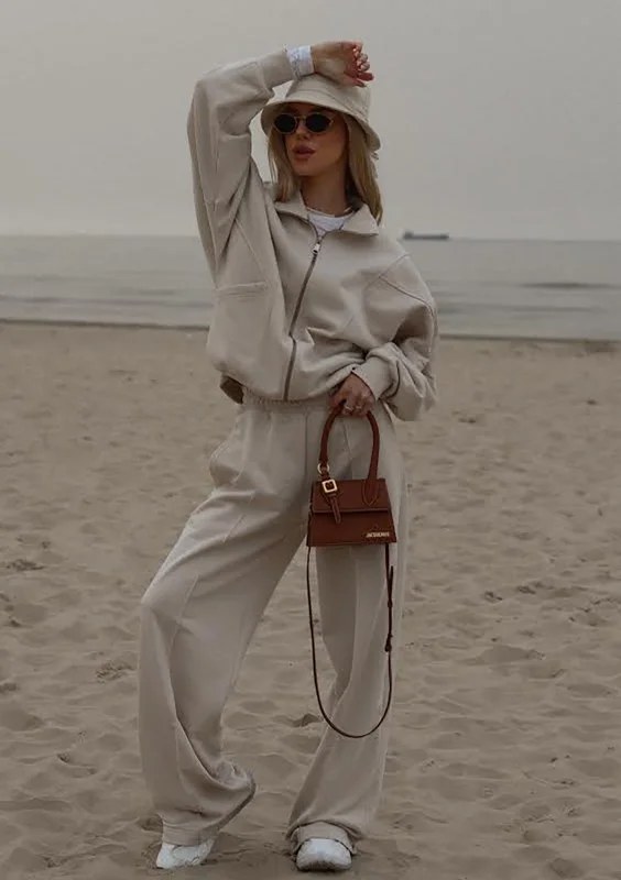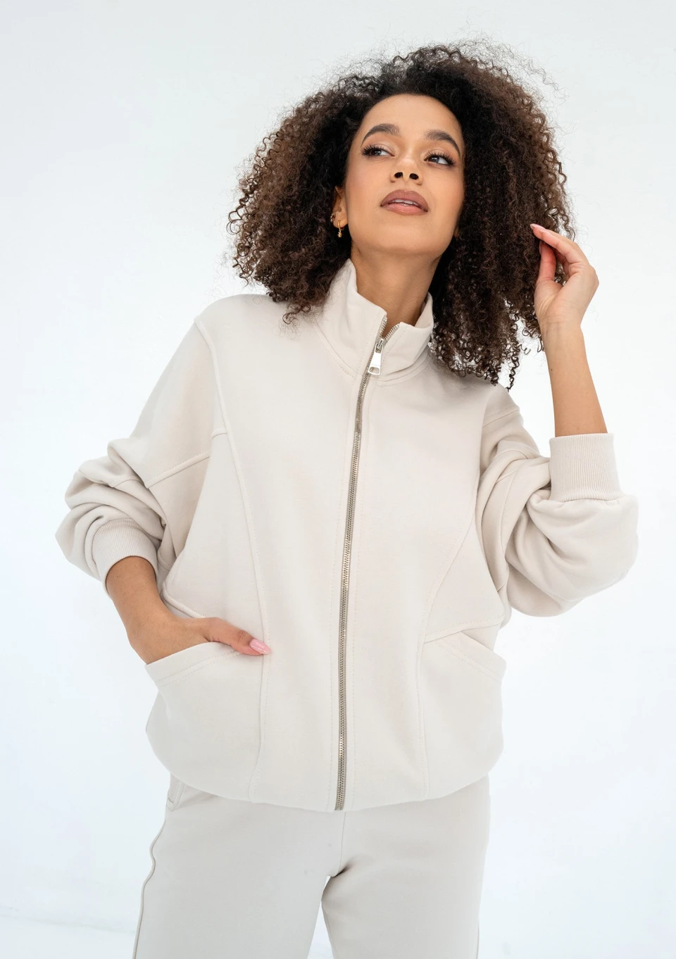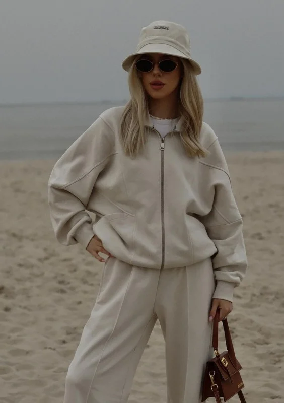 Modna bluza dresowa oversize o wygodnym, rozpinanym kroju. Model ze stójką i kieszeniami, w kokosowym kolorze. Logo z tyłu, w formie naszywki.